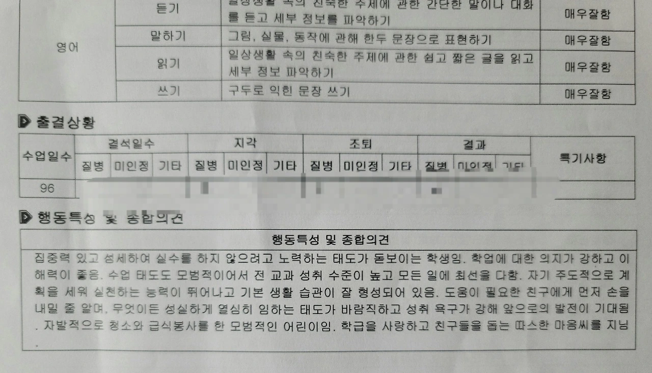 마지막 부분이 중요한데 선생님께서 직접 적어주시는 행동특성 및 종합의견입니다. 이 부분에서 선생님이 아이의 관찰을 통해 부모에게 전달하고픈 이야기를 하는 것이죠.