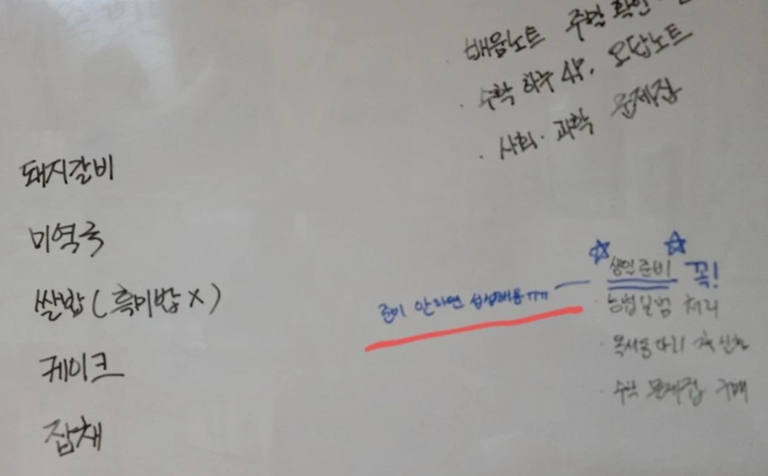 화이트보드에 생일에 대한 내용을 비롯해 메모를 이것저것 해두었습니다. 그중에서 '생일 준비'라는 메모에 아이가 달아놓은 글을 보니 그냥 넘어갔다가는 정말 안 되겠구나 라는 생각이 절로 듭니다.
