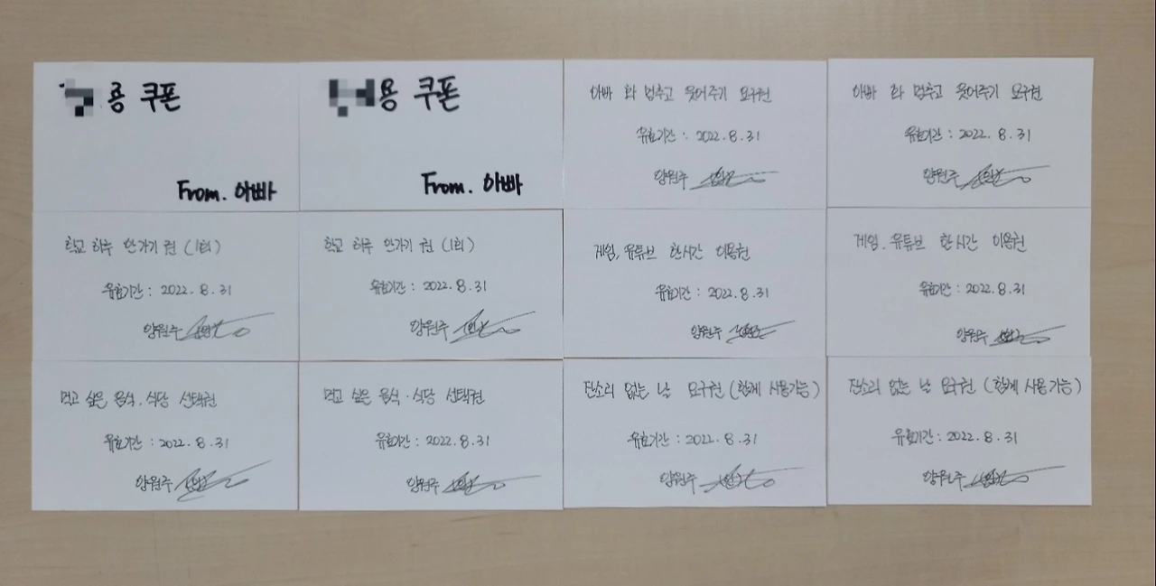 아빠 화 못내게 하기 등등 몇 가지를 아이들의 니즈에 맞춰서 제 명함 뒤에 적어서 만들어 주었습니다. 돈이 안들어서 좋기는 한데 힘은 엄청 드네요. ^^;;
