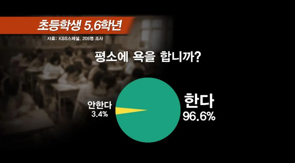 안타깝게도 우리 아이도 자라면서 욕을 배우게 될 것이고 쓰기도 할 것입니다. 부모의 말이나 tv, 유튜브, 게임, 친구, 학원 등등 경로는 다양합니다. 문제는 아이들이 어른이 생각했던 것보다 너무나도 이른 시기에 욕설을 일상어처럼 자연스럽게 쓴다는 점입니다. 욕설을 사용하는 초등학생의 비율은 예전과 비교했을 때 점점 높아지고 있습니다.