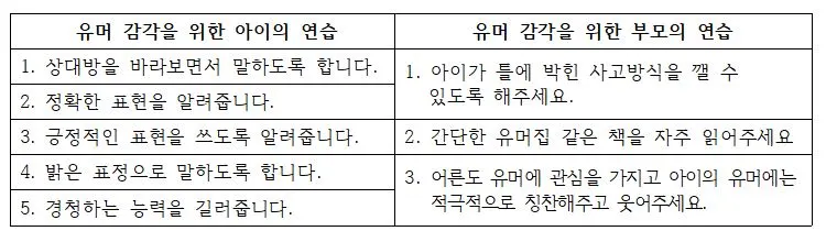 유머 감각을 키우기 위해서는 틀에 박힌 사고방식, 즉 고정관념을 깨는 것이 중요합니다. 책을 자주 읽는 것은 기본입니다. 간단한 유머를 찾아서 알려주어 기억하게 해주는 것도 좋습니다. 가장 중요한 점은 어른도 부지런히 평소에 유머 있는 모습을 보여주면서 아이 유머에는 자주 웃어주며 가장 열렬한 팬이 되어야 합니다. 아이의 유머는 아이의 삶을 좀 더 풍요롭고 여유롭게 살 수 있게 도와줄 수 있는 중요한 역할을 할 것입니다.