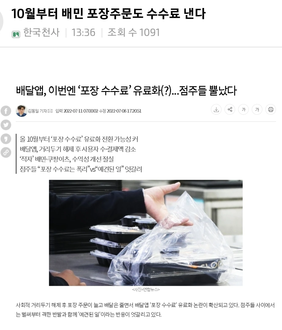 배달 플랫폼에서 만약에 포장 주문에 대한 수수료를 받겠다고 하면 받으라고 하고 그 플랫폼을 이용하지 않으면 되는 것이죠.