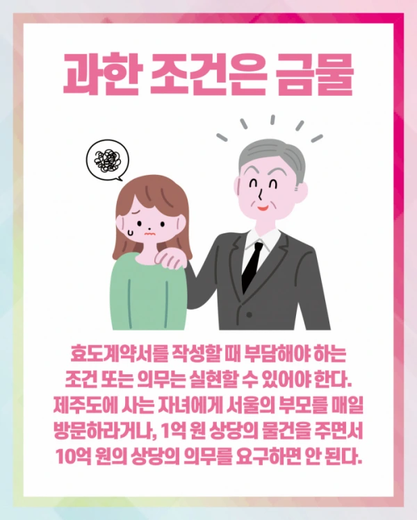 실제로 제 부모님도 주위 지인들께 이런 이야기를 자주 들었다고 합니다. 자녀에게 경제적인 지원을 해줘서 능력이 없어지면 나중에 부모를 무시할 수도 있다고 말이죠. 그렇기에 부모가 경제력을 가지고 있어야 자식이 효도를 할 거라고 말하신다고 합니다. 일견 효도 계약서 작성의 취지와 맞는 이야기 같습니다.