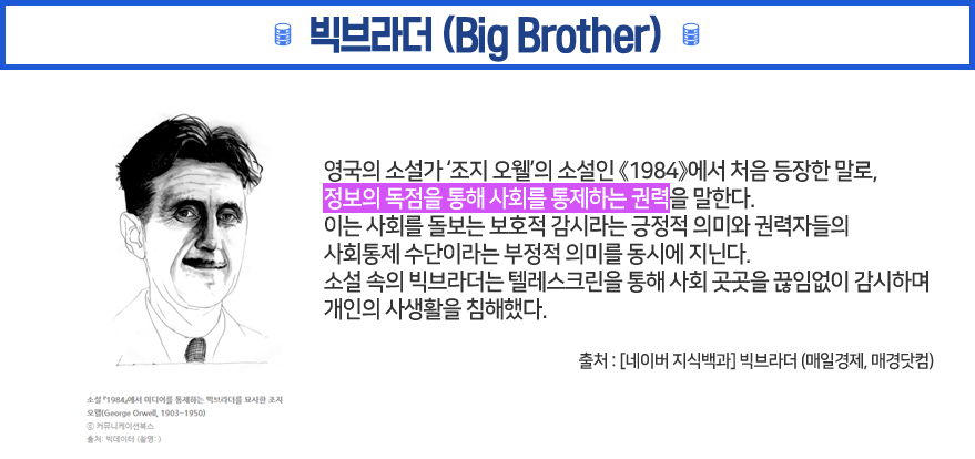 정보독점을 통한 사회 통제를 의미하는 '빅브라더'는 조지 오웰의 소설 <1984>에서 등장한 표현입니다. 빅브라더는 이미 존재하고 있다고 봐도 무방하죠.
