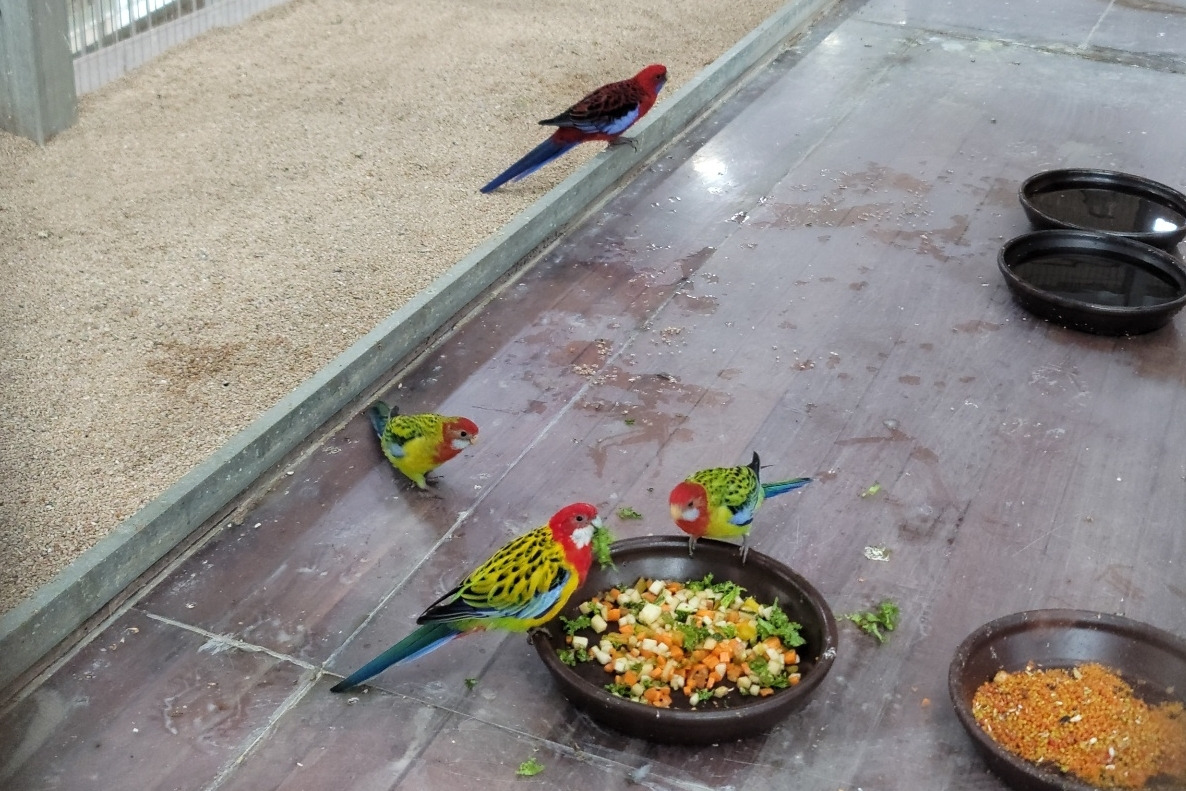 이제 중간 크기의 새들을 만나러 갑니다. 손에 올릴 수 있는 크기의 형형색색. 앵무새들이 여기저기 흩어져 있습니다. 이 아이들은 손에 씨앗을 올려주면 슬그머니 날아와 독특한 구조의 부리와 혀를 이용해서 껍질을 까서 알맹이를 기가 막히게 꺼내먹습니다. 물론 손바닥에 올리면 거친 발톱 때문에 따끔한 느낌은 있지만 그렇게 심하지는 않습니다.