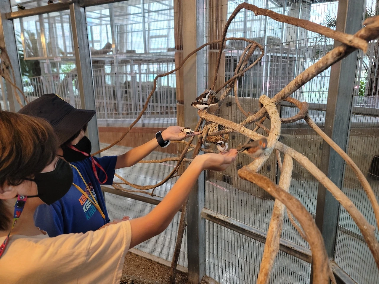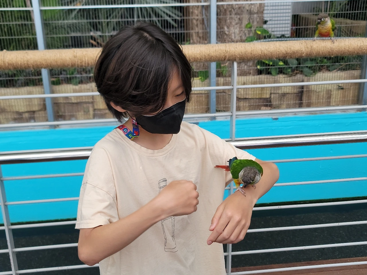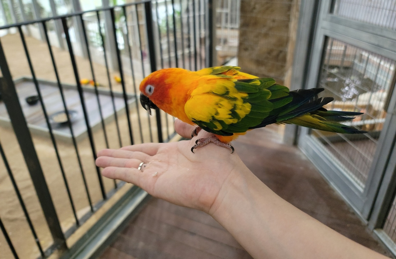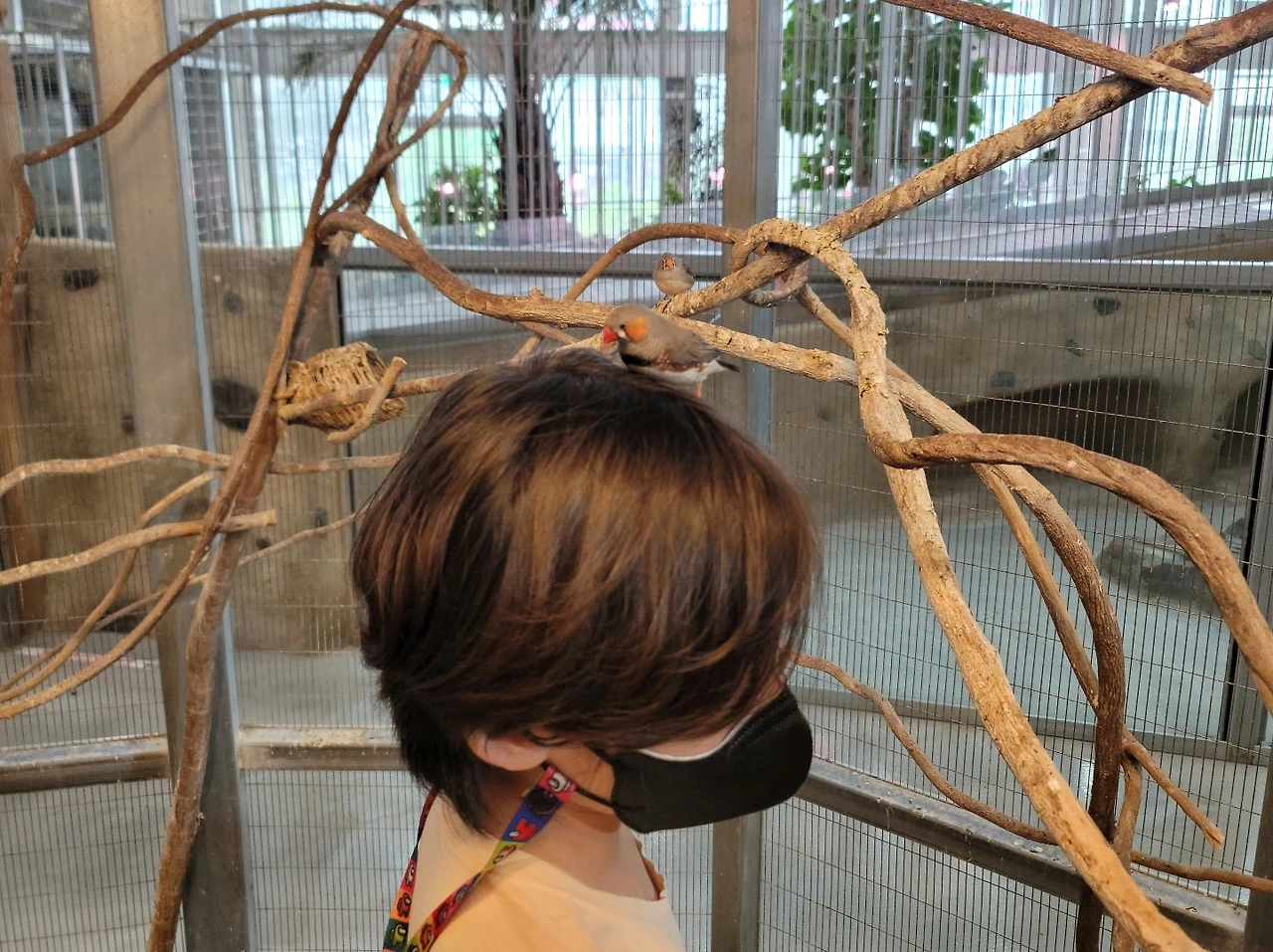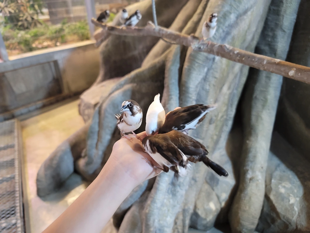 일단 작은 새부터 보기 시작했습니다. 핀치라는 조그만 새들이 있는 새장으로 들어갑니다. 전용 먹이인 좁쌀을 손에 올려놓으니 핀치들이 몰려듭니다. 새를 밟지 않게 바닥을 조심하라는 문구가 있는 것을 보고 무슨 말인가 했는데 정말 작습니다. 안에서 계속 있다 보니 친근해졌는지 손뿐만 아니라 심지어는 머리 위에도 편안하게 올라오네요.