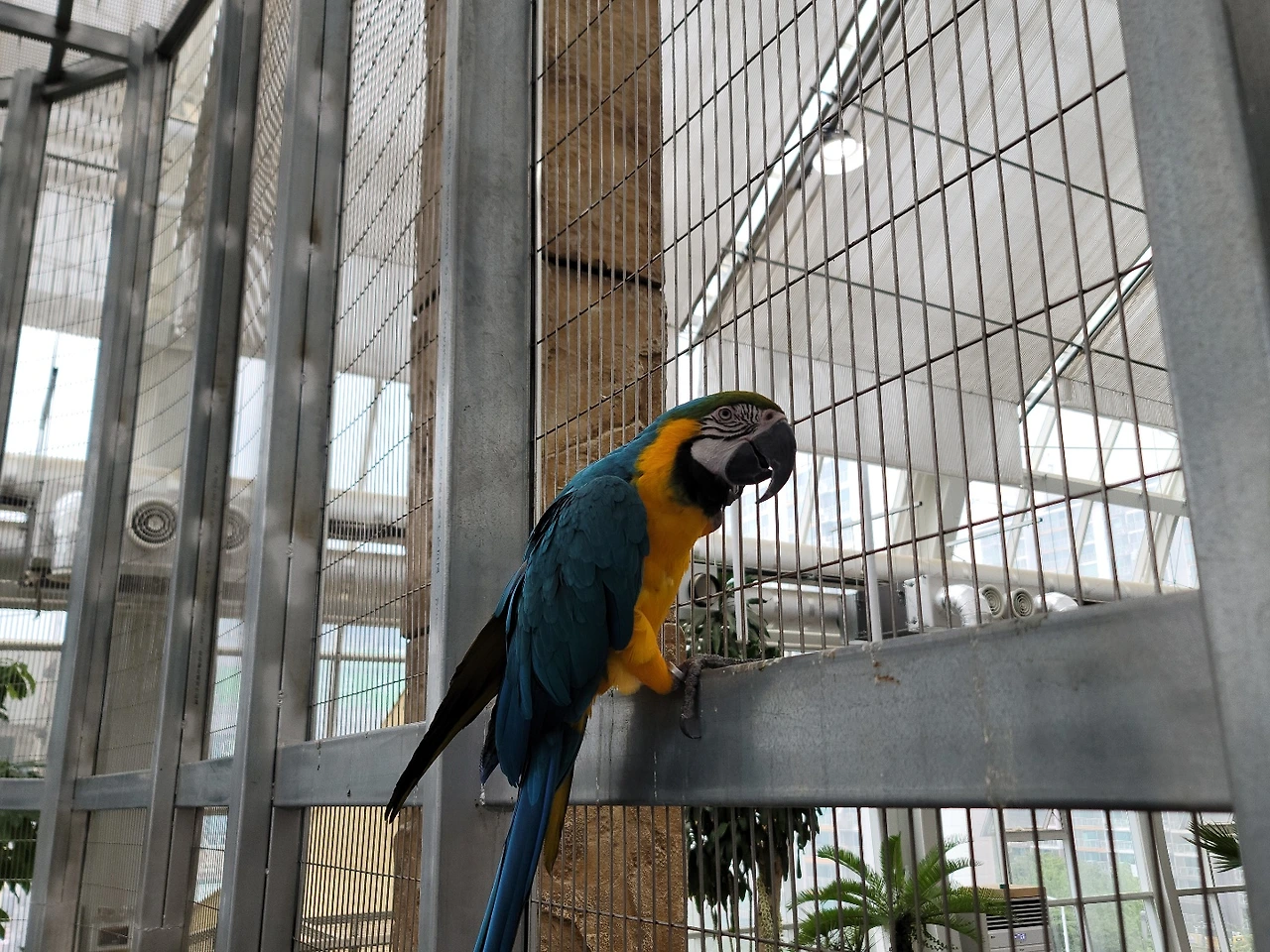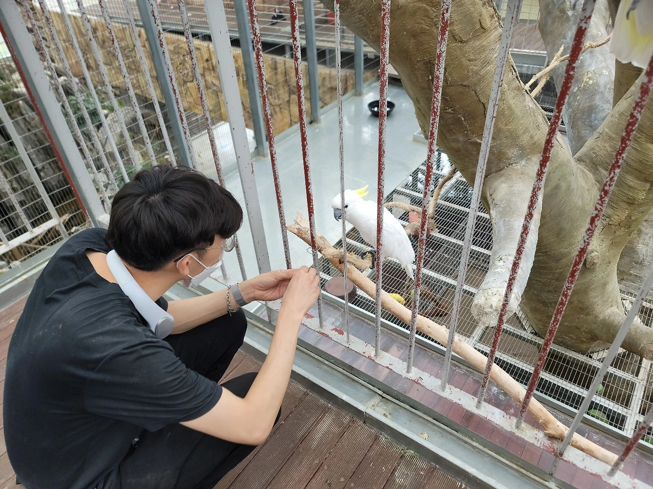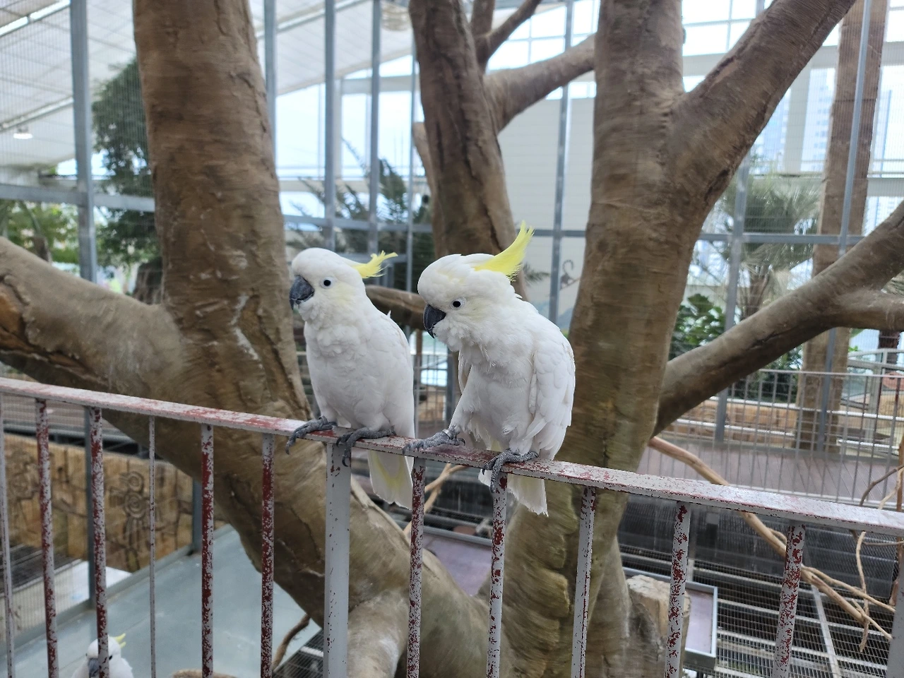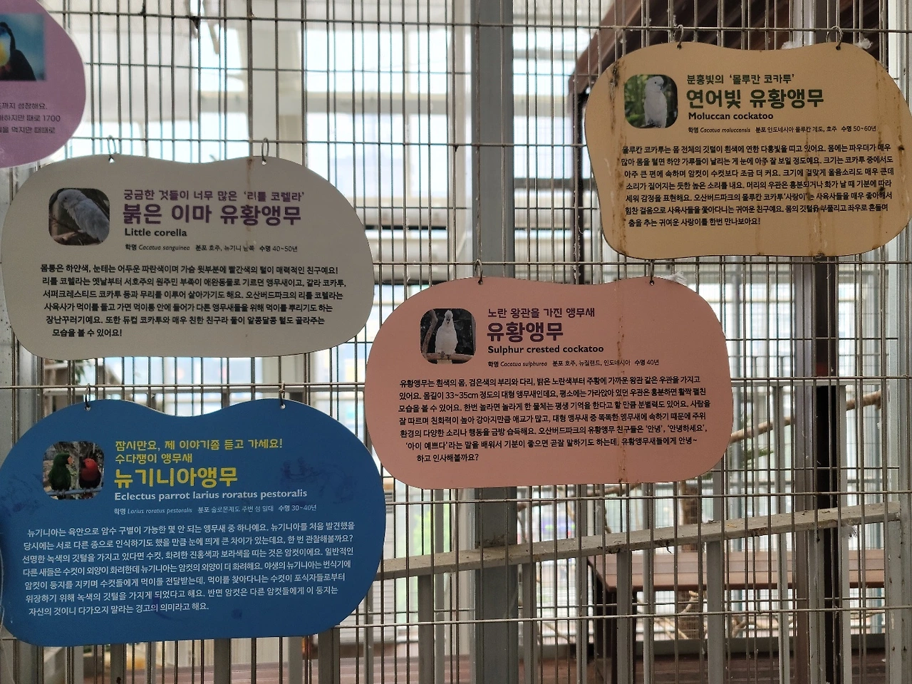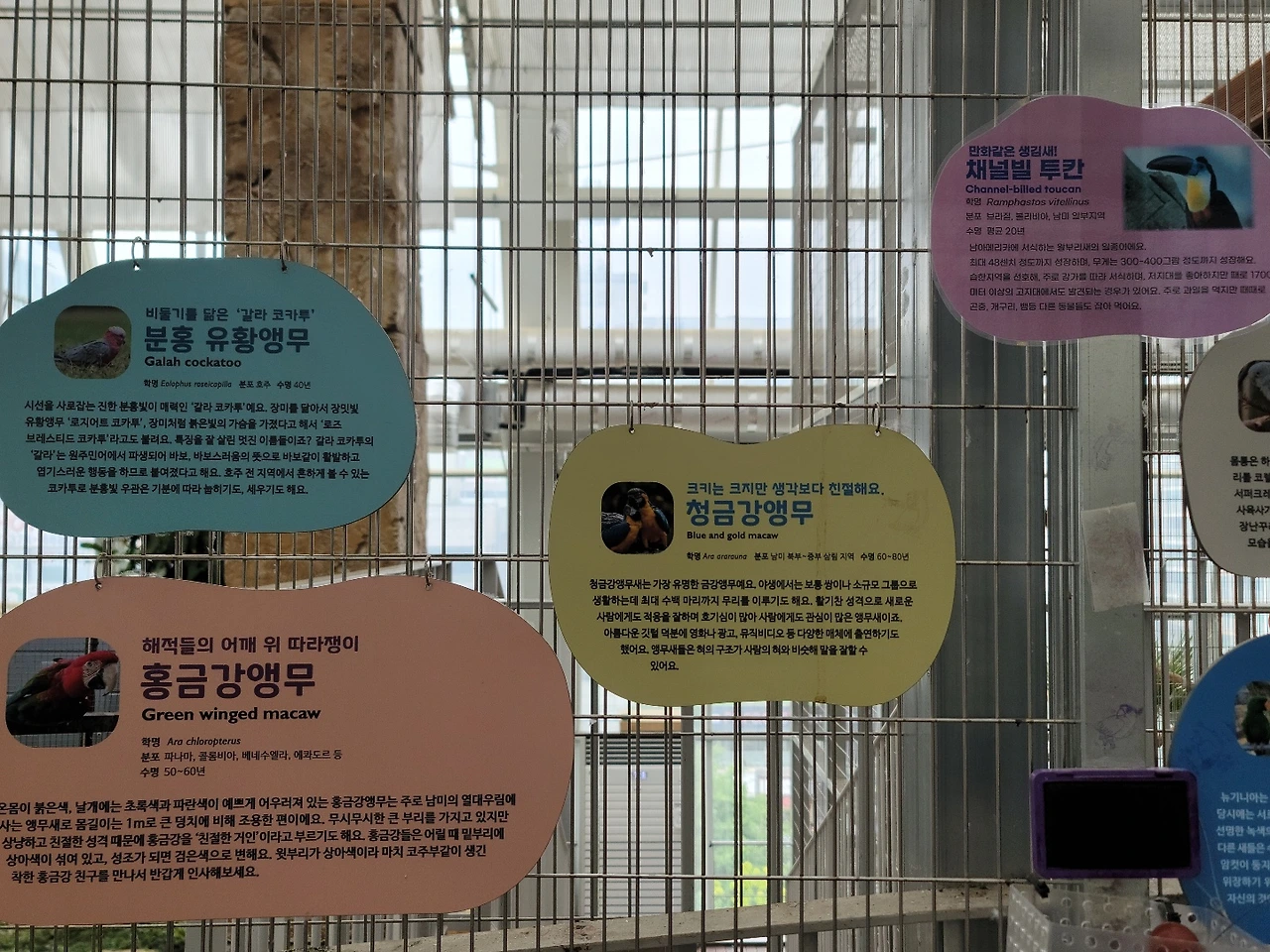 작은 친구, 중간 친구를 만났으니 이제는 특대 사이즈 친구들도 만나러 갑니다. 이름도 유황앵무, 홍금강앵무, 청금강 앵무 등 다양합니다. 놀라운 것은 사육사 분과의 대화를 통해 제일 귀엽게 생긴 유황앵무가 제일 성질이 사나워서(?) 그 둥지 안에서는 대장 노릇을 한다는 점이었습니다.