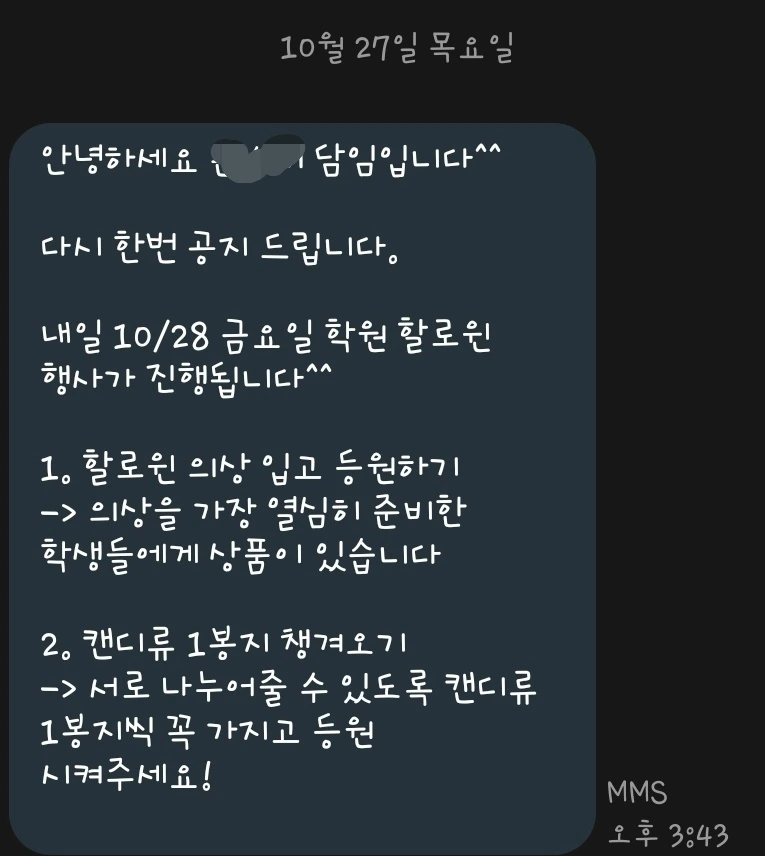 학원에서 공지사항으로 핼러윈 행사 준비를 해달라는 메시지가 왔습니다. 솔직히 이게 중요한 공지사항인가 싶지만 일단은 아이들과 이 주제로 대화를 나눠봅니다.