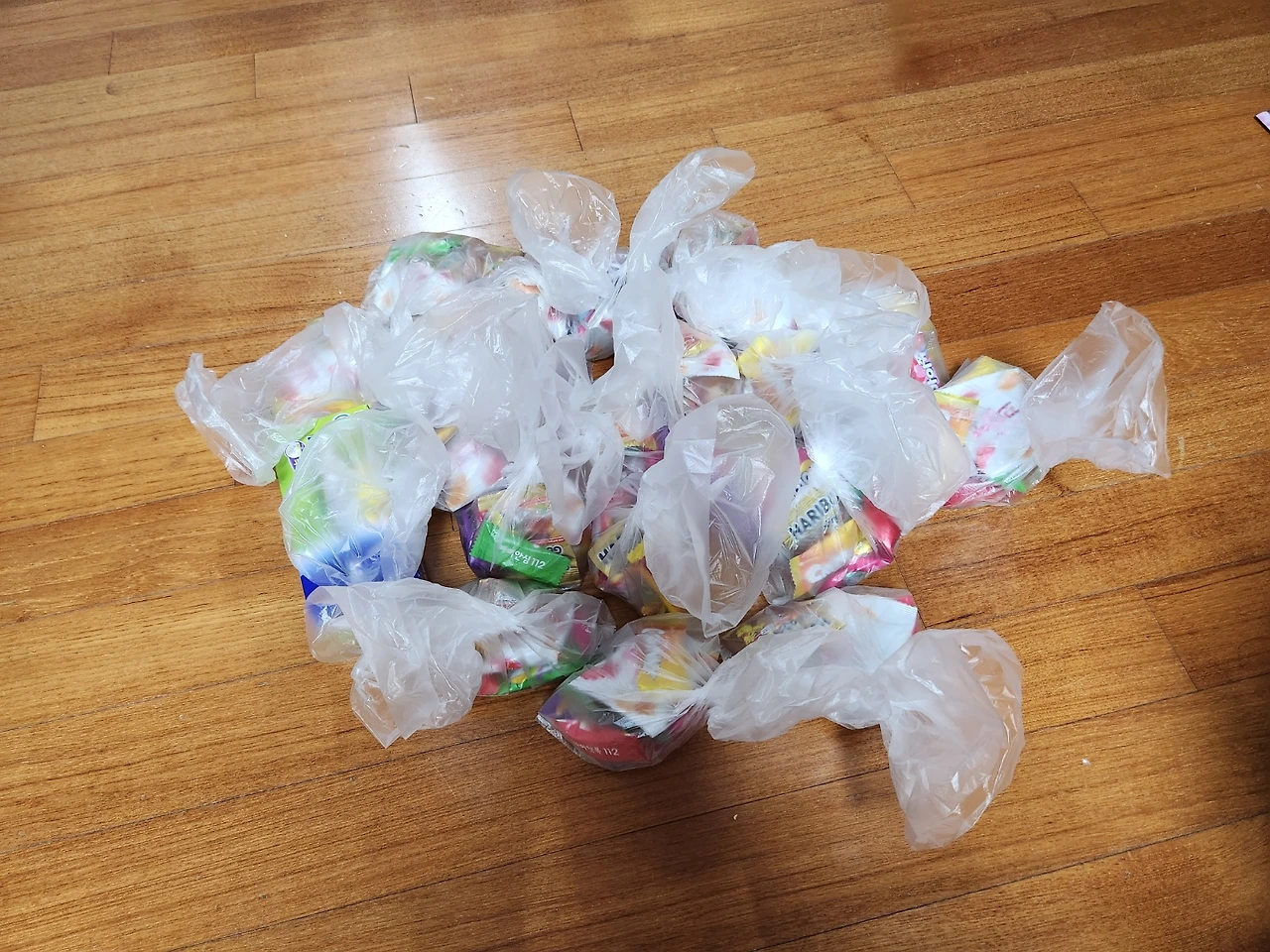 재잘재잘 대면서 포장을 하다 보니 10분도 되지 않아 드디어 완성!! 학원 친구들과 동네 친구들에게 나눠줄 곰젤리+지렁이모양젤리+마2쮸 4종+초코바가 들어간 핼러윈용 6종 선물 세트 정리가 마무리되었습니다.