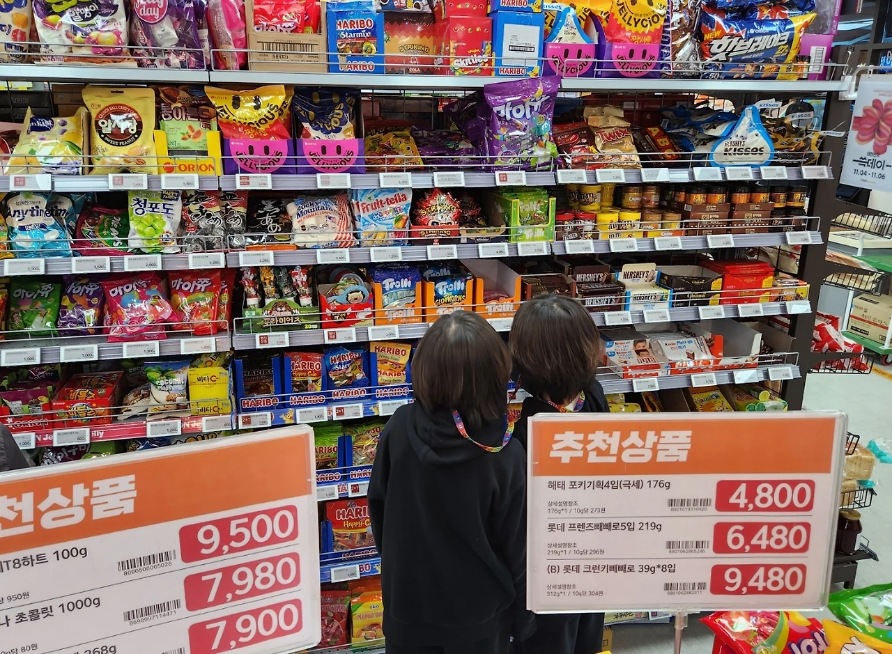 그래서 결국 어제 저녁식사를 먹은 뒤 오늘 쓸 간식을 사기 위해 마트로 갑니다. 마트에 가니 사탕, 초콜릿, 젤리, 캐러멜 등등 부모님들이 보면 기겁할만한 주전부리가 넘쳐납니다. 어른인 저조차도 먹어보고 싶은 과자가 보이니까요. 견물생심이라는 말이 그래서 나오는 모양입니다.