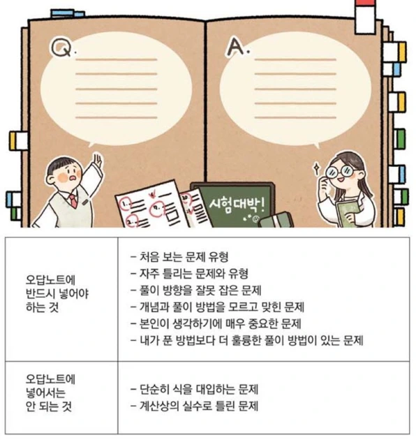 오답 노트는 모범생들의 수기에 어김없이 등장하는 일명 ‘만능 치트키’입니다. 물론 아직 글쓰기를 하는 것도 시원찮은 아이에게 아무리 좋은 방법이라고 한들 오답 노트를 만들라고 하는 게 가능할 리 없습니다.