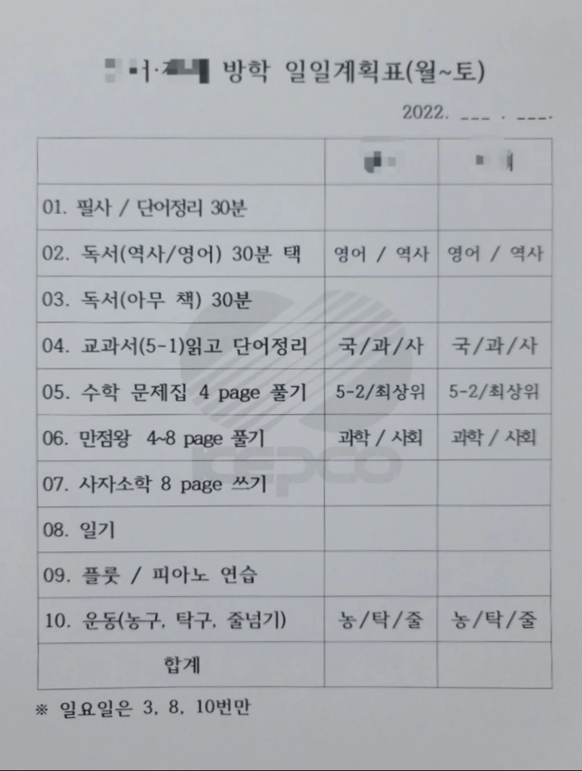 이번 방학의 계획표에서 주안점을 둔 것은 수학에 대한 복습이었습니다. 5학년 1학기의 수학에 대한 심화학습이 부족했다고 생각했기 때문입니다.