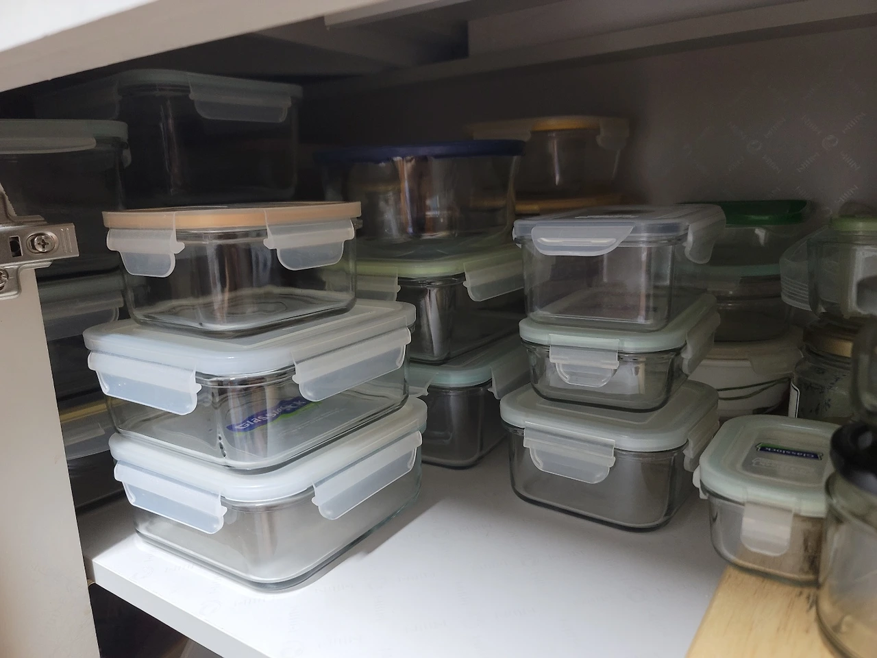 이런 식으로 열심히 끼니를 챙겨 먹으며 반찬통을 정리하는 행위를 계속하다 보면 냉장고가 가벼워집니다. 그와 반대로 반찬통을 보관하는 수납장은 점점 빈 통들로 가득 차게 됩니다.