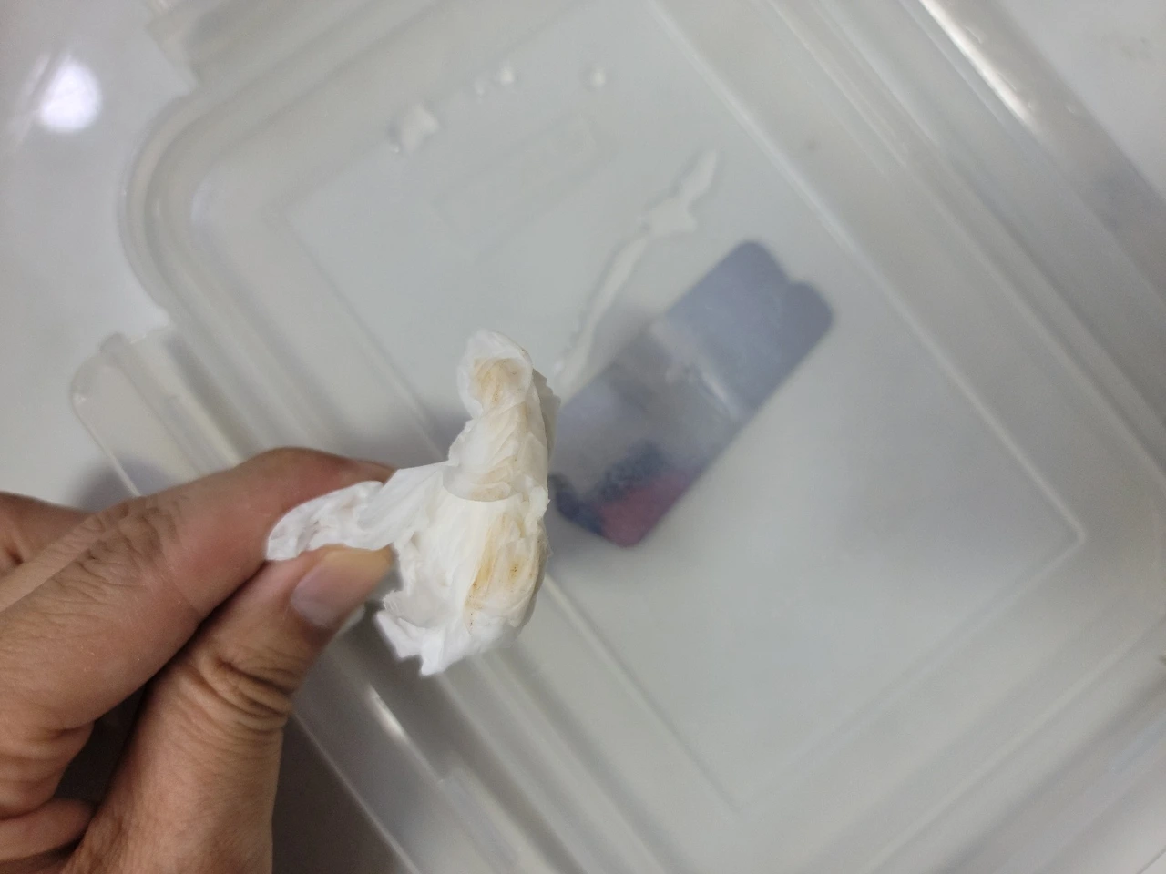 5. 뚜껑의 고무패킹을 신생아를 다루듯 조심스럽게 이쑤시개로 분리한 뒤 따로 키친타월로 한 번 닦아낸다.