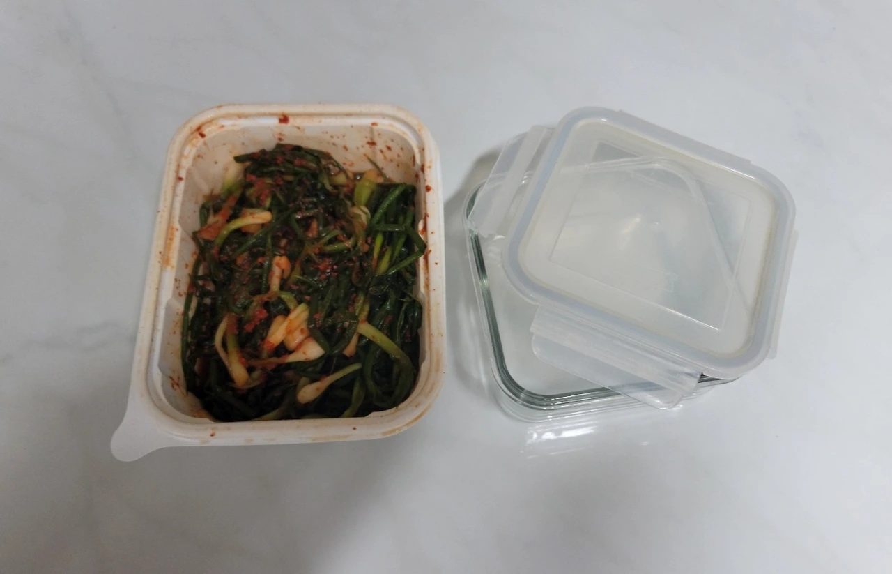 식사를 하고 설거지를 하기 전에 수시로 하는 행동이 있습니다. 사진처럼 반찬을 큰 용기에 먹다가 반찬통에 빈 공간이 생기면 잽싸게 옮겨 담는 것입니다. 빈 공간에 있는 공기로 반찬이 변질되는 시간을 최소화하기 위해서죠. 소소한 저의 즐거움 중 하나입니다.