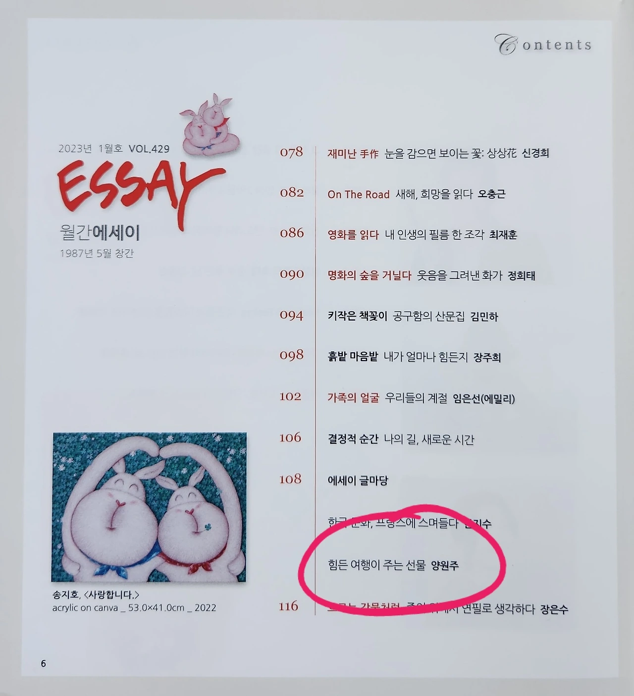 일단은 제 원고가 유명한 잡지에 올라간 것도 영광이었지만 한편으로는 표지도 참 마음에 들었습니다. 내년 2023년은 계묘년(癸卯年)인데 일명 검은 토끼의 해라고도 불린다고 합니다. 공교롭게도 저희 아이들도 쌍둥이 토끼띠 출생입니다. 거기에 제 글이 실린 잡지에 사이좋아 보이는 쌍둥이 토끼 두 마리가 표지에 있으니 그냥 보기만 해도 흐뭇했던 것이죠. 여러모로 의미가 있었습니다.