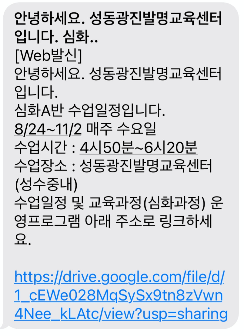 문제는 시간이었습니다. 수요일 오후 4시 50분부터 시작하는 수업인 데다가 수업을 하는 성수중학교가 집에서 가장 먼 위치에 있는 학교였기에 아이가 스스로 가기에는 쉽지 않은 상황이었습니다. 어른이 함께 아이를 데리고 움직여야만 했죠.