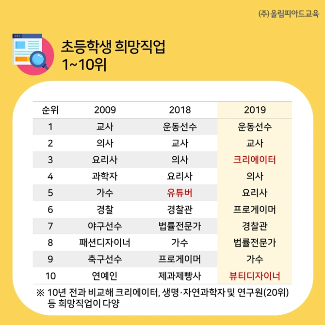 예전에 제가 청소년이었던 시기와 비교했을 때 현재 아이들의 장래희망과 입시환경은 엄청난 변화를 겪었습니다. 학생들의 희망직업은 일부 전문직을 제외하고는 대부분 바뀌었습니다. 나이에 따른 희망직업의 변화도 크죠.