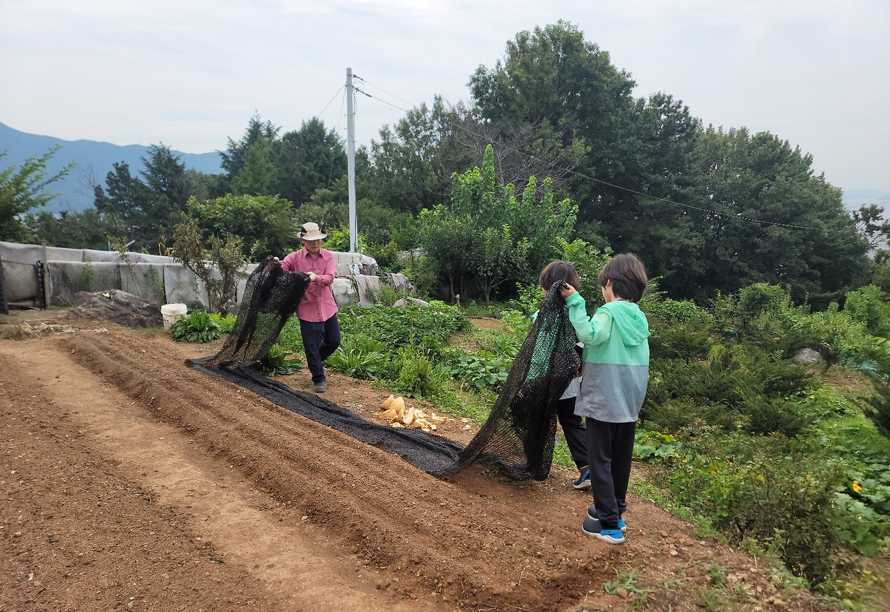 시커먼 그물이 쳐져있길래 무엇인가 궁금해졌습니다. 아이들이 할아버지를 도와서 함께 걷고 있길래 물어봤더니 무씨를 심어놓은 곳이라고 합니다. 아주 자그마한 무싹이 돋아나 있는 모습을 관찰하는 2호의 모습이 사뭇 진지합니다.