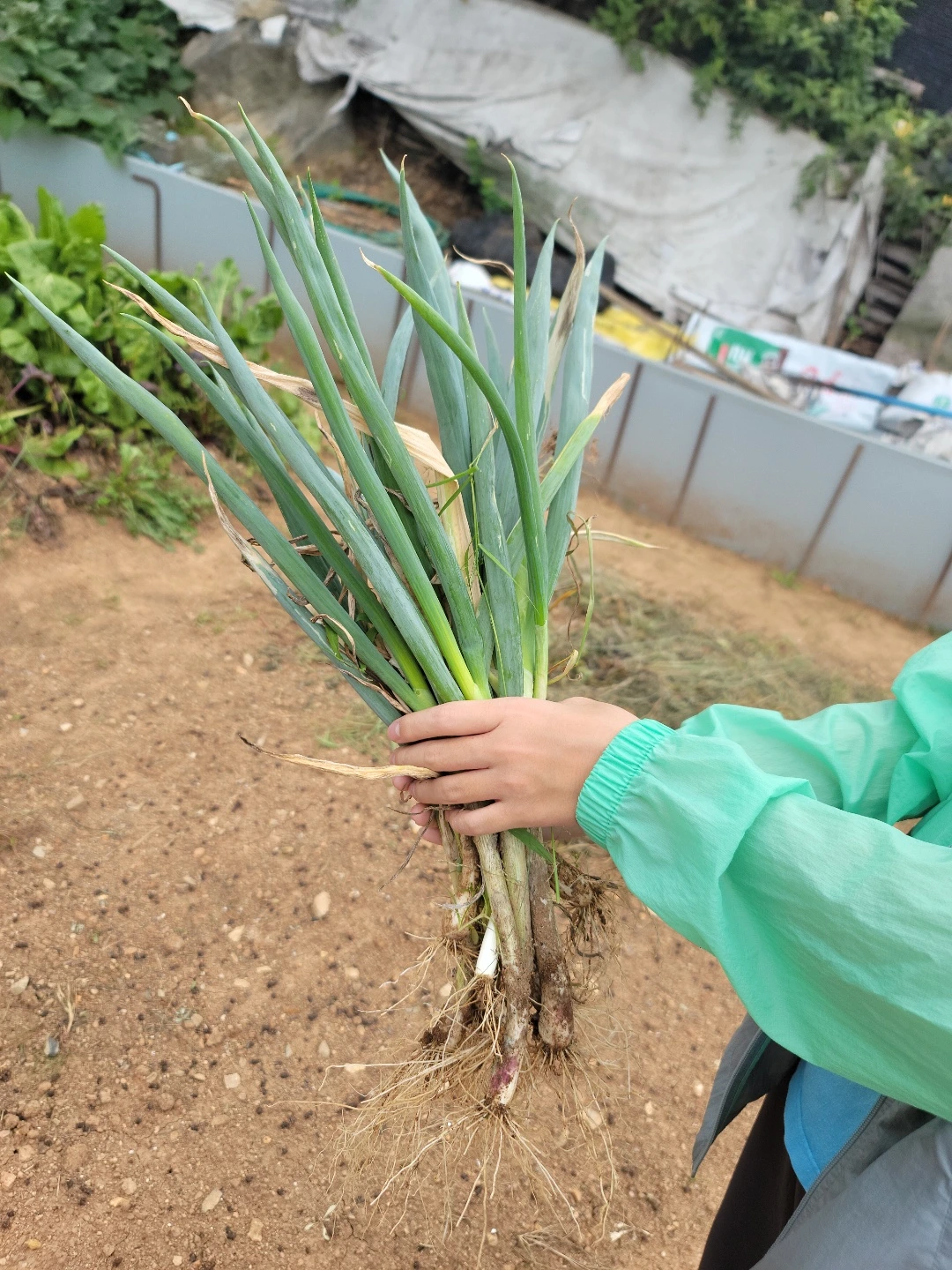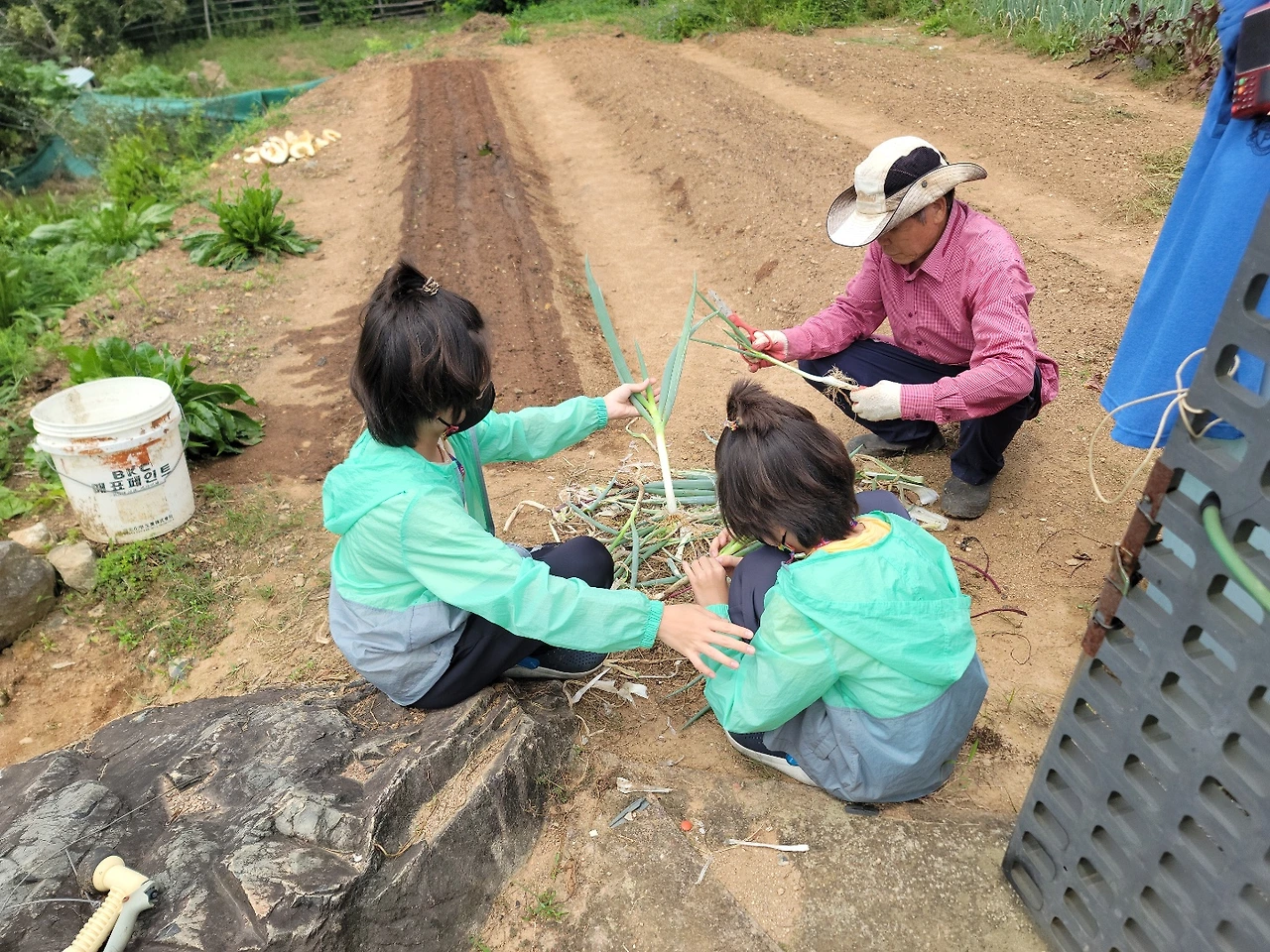 파 다듬는 둥이들, 이 아이들은 농부인가 학생인가?