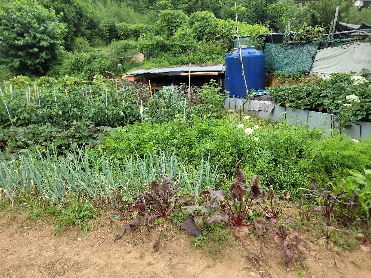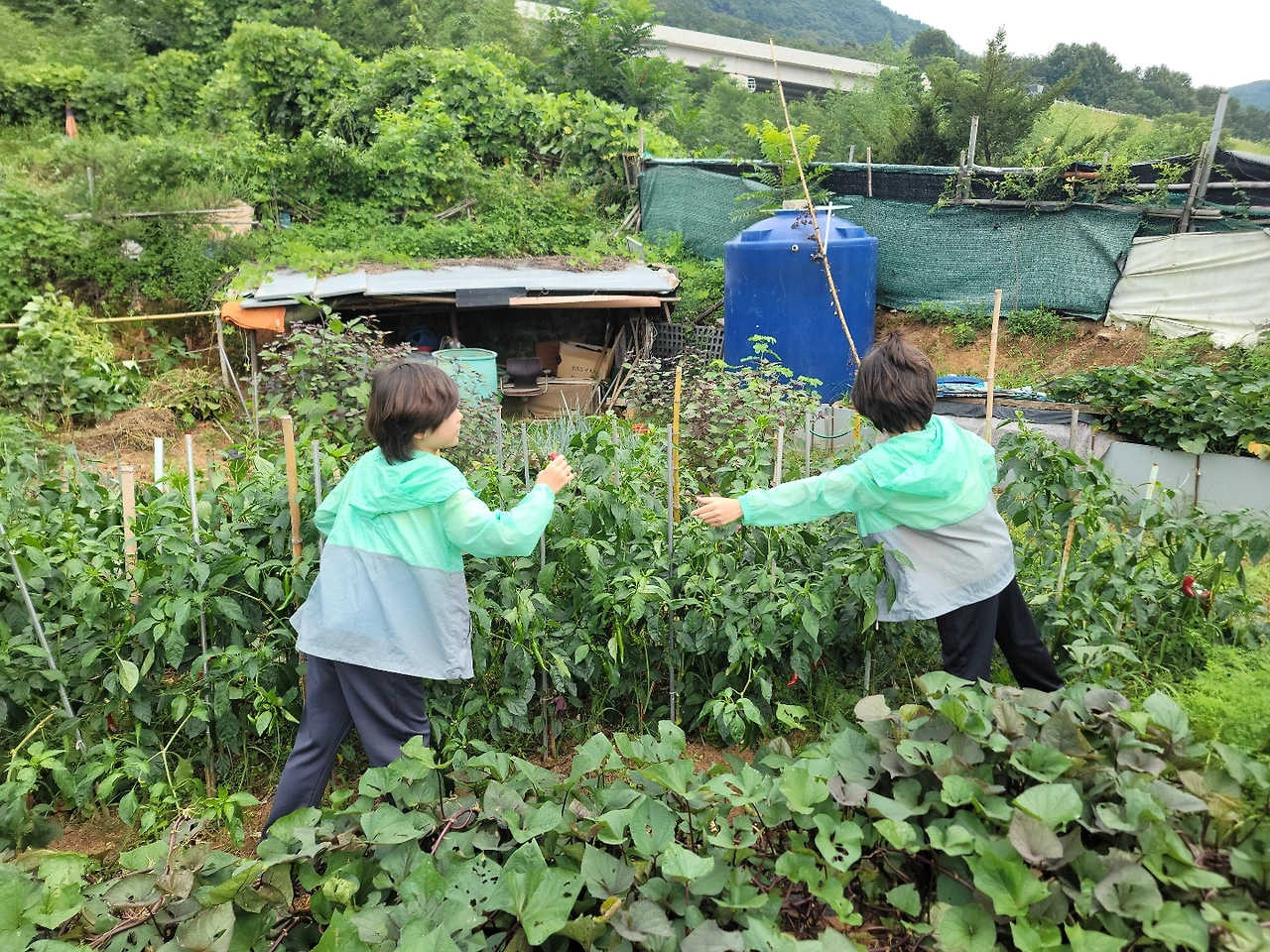 짧은 시간 동안이었지만 아이들은 텃밭에서 많은 것들을 하고 내려갑니다. 물론 그 정도로는 부족했던 모양입니다. 이따가 다시 올라와서 잡초를 뽑고 싶어 하는 강력한 의욕을 보였으나 산모기가 너무 기승을 부려서 모든 가족들이 만류하는 바람에 고집을 꺾을 수밖에 없었죠. 다음 기회를 또 노리기로 했습니다.
