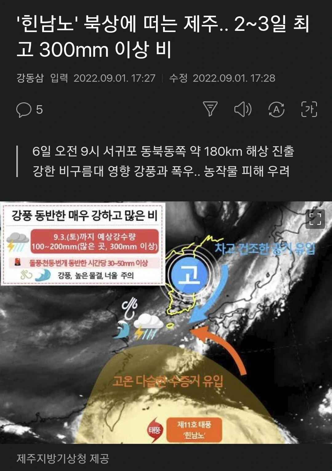 그런데 시간이 갈수록 태풍에 대한 기사가 늘어나더니 급기야 힌남노와 제주도가 조합된 기사 제목들이 속속 올라오기 시작합니다. 조금씩 위기감을 느낀 아내가 가도 괜찮겠냐고 묻자 저는 저녁에 다시 이야기를 해보자고 말했습니다.