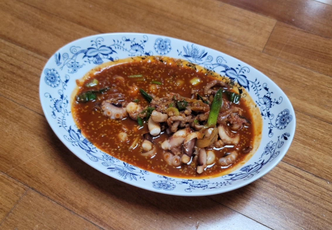 조리를 마치고 접시에 담은 낙지볶음을 보니 절로 밥을 비벼먹고 싶은 기분입니다. 물론 국물이 많이 생기긴 했지만 그렇게 짜거나 맵지는 않아서 아이들도 맛있게 먹었습니다.