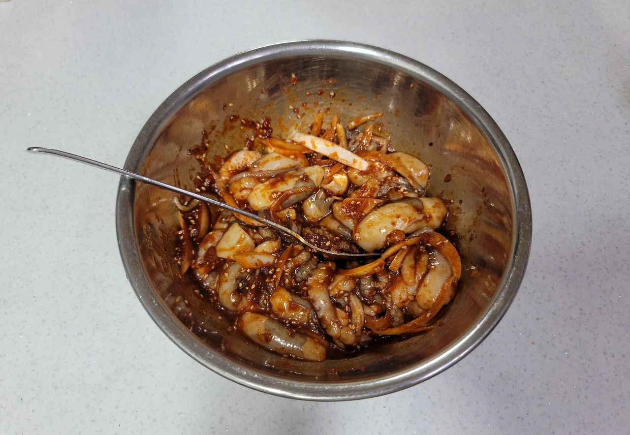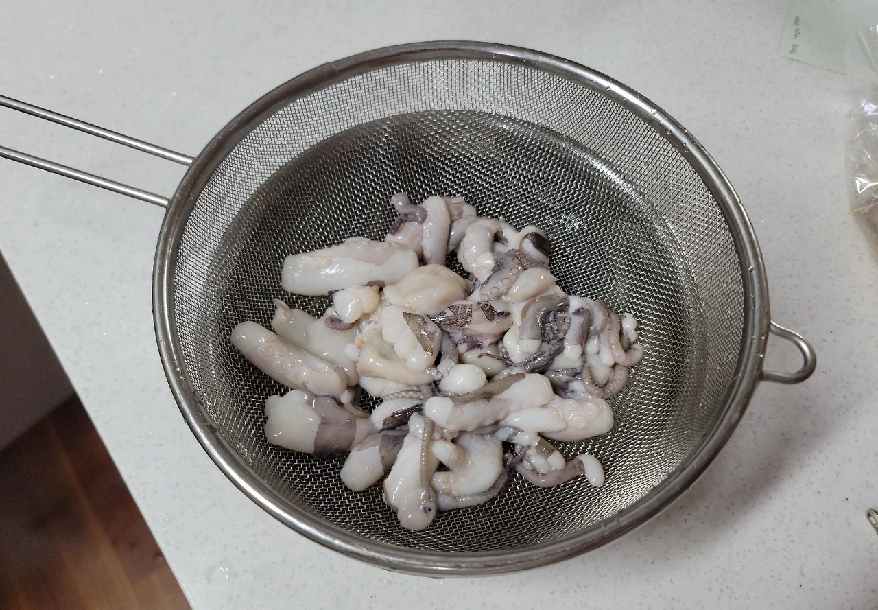 일단 낙지볶음은 아내가 전담해서 준비합니다. 마트에서 산 태국산 낙지는 신선도가 나쁘지 않습니다. 물에 씻은 뒤에 물을 빼놓습니다.