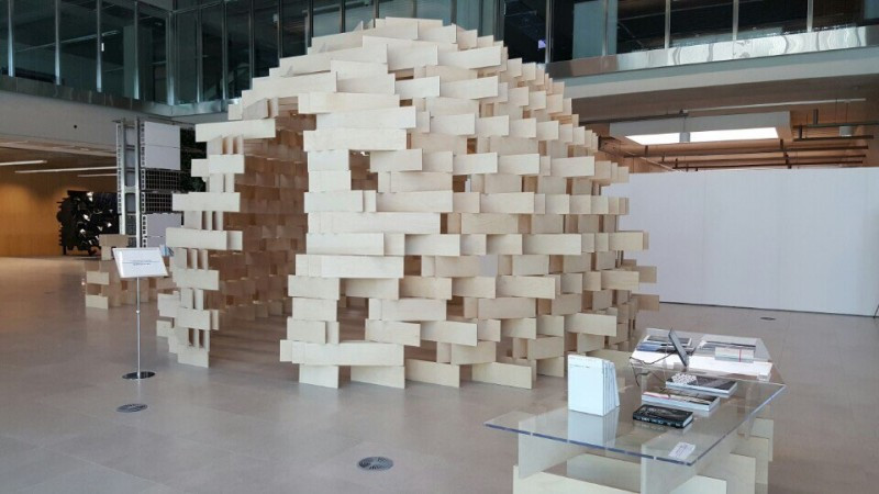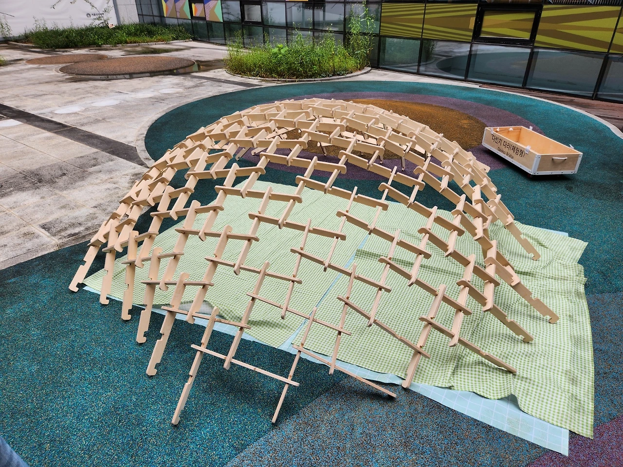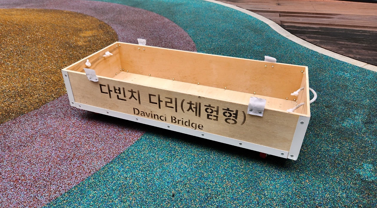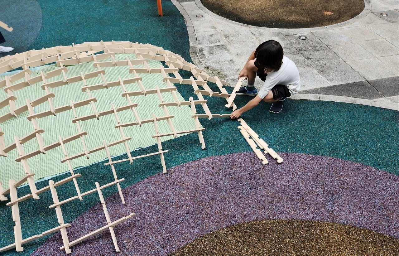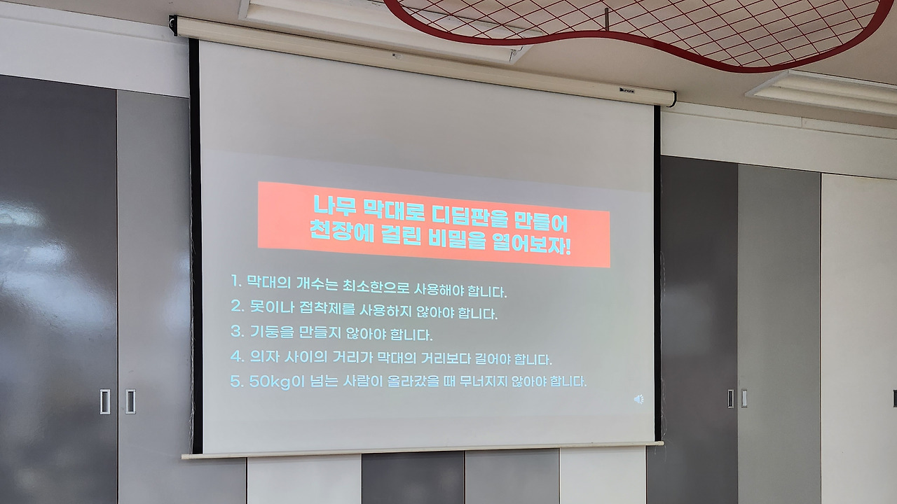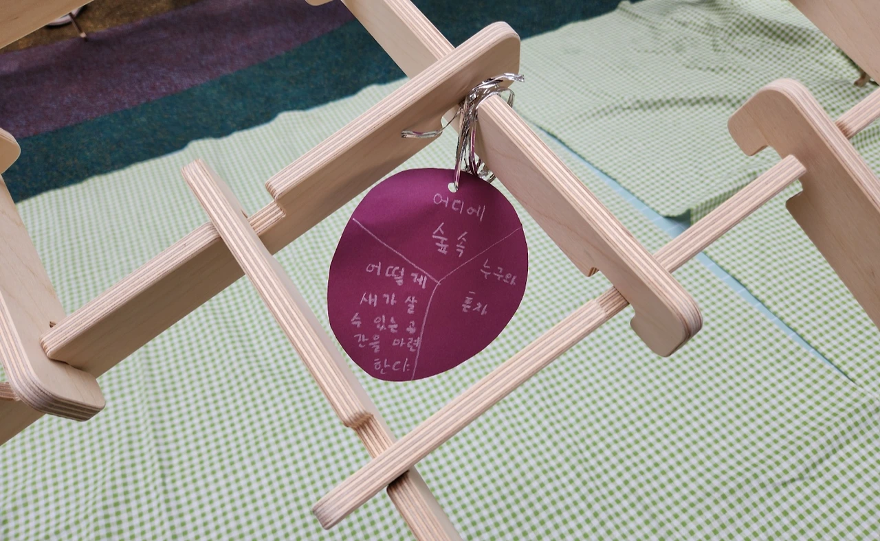 프로그램을 시작하면서 실내에서는 간단한 설명과 실습을 하는 시간을 가집니다. 아빠와 함께 푸는 퀴즈가 나오는데 파빌리온 방식이 얼마나 견고한지를 알려주기 위해서입니다. 지그재그로 아귀를 맞춰서 나무를 끼워 넣으면 하중을 꽤 많이 버틸 수 있을 정도로 견고 해지는 것이죠.