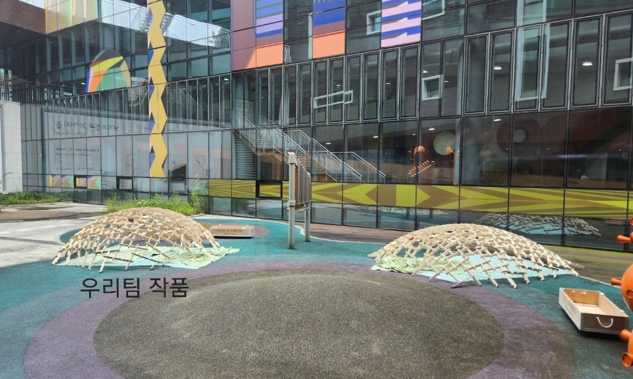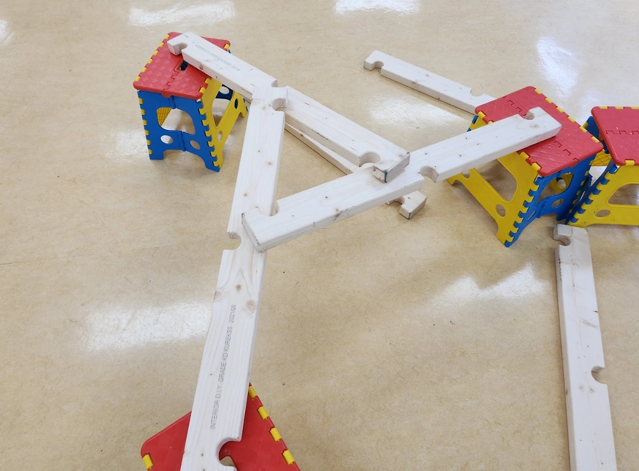 나중에 먼발치에서 사진을 찍어서 보니 괜스레 저희 팀의 작품이 더 잘 만든 것처럼 보입니다. 저희끼리 이야기지만 상대팀은 한 번 무너져서 나무도막이 부서지기까지 했었거든요. 1호와 저는 저 나무도막을 합쳐서 한 번 더 만들면 좋겠다는 이야기를 하며 수업을 마무리했습니다.