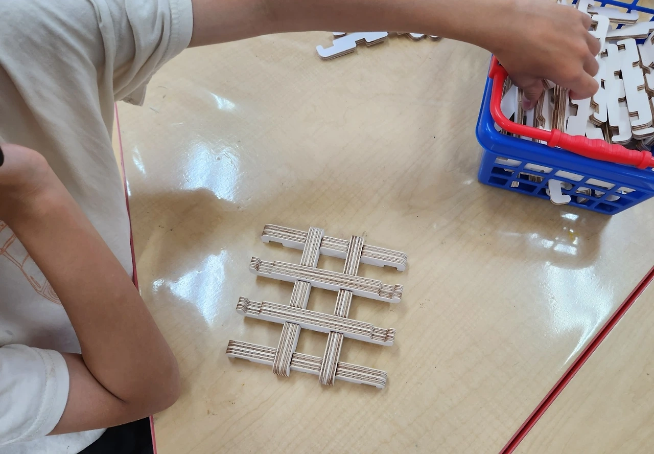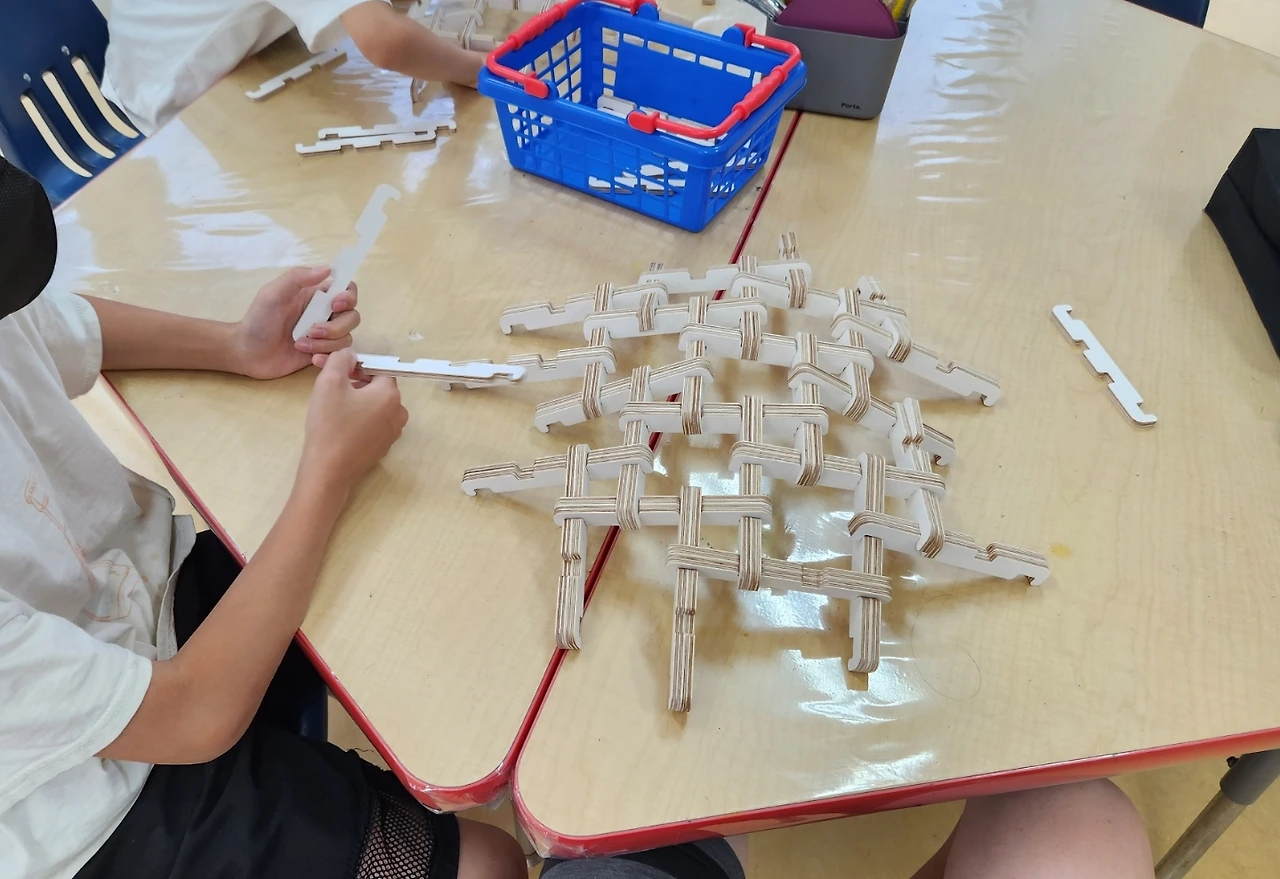 퀴즈를 마친 뒤에 종이 재질의 장난감으로 미리 사전 실습을 해봅니다. 다른 아이들은 하나씩 사용해서 연결해 나가는데 저희 부자는 더 촘촘하게 만들기 위해 자재를 두 개씩 엮어서 돔 형태로 만들어냅니다.