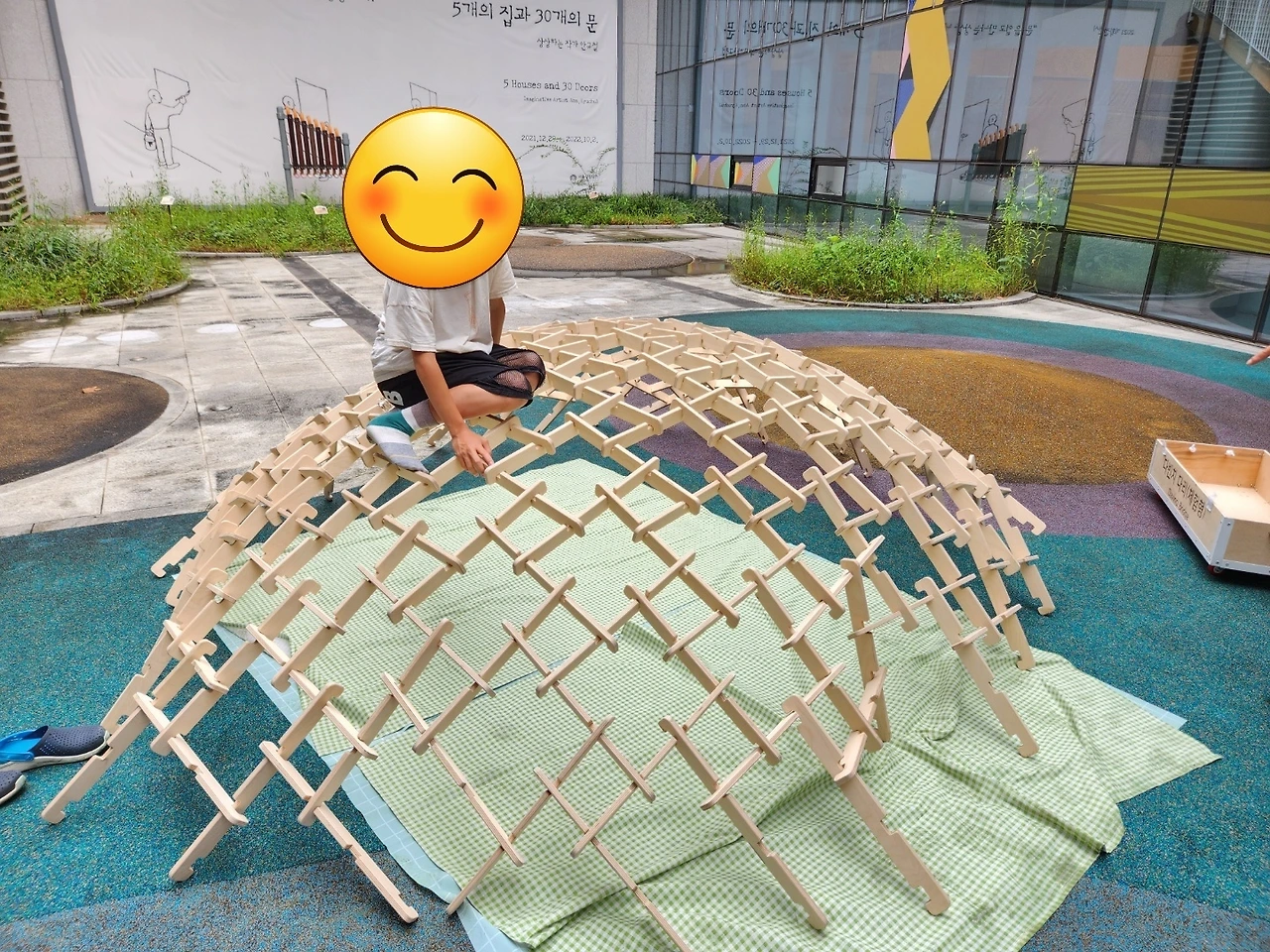 이제 밖으로 나갑니다. 커다란 상자 안에 들어있는 나무 블록들로 파빌리온을 만들기로 합니다. 참가 가족은 총 다섯 집입니다. 저희는 두 가족이 한 팀이 되는 쪽에 배정이 되어 시작합니다. 처음에 우왕좌왕하다가 본격적으로 만들어나가기 시작합니다.