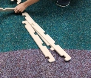 이 퀴즈로 세 개의 나무 막대기로 삼각형 모양의 디딤판을 만드니 선생님이 그 위로 올라가도 무너지지 않고 버텨냅니다.