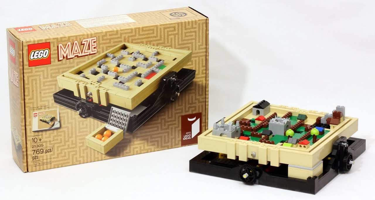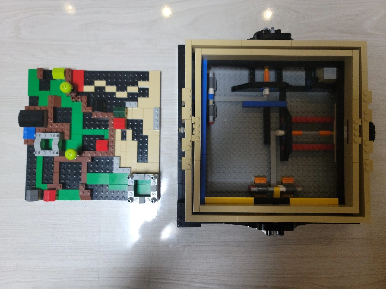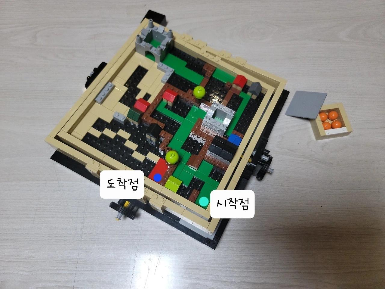 이 미로형 레고의 특징은 미로를 동그란 블록 공을 위에 얹습니다. 사진 오른쪽에 있는 미로 틀의 톱니바퀴로 상하좌우로 조작해서 경사를 이용해 그 공을 움직이게 만듭니다. 드디어 극악의 난이도를 지닌 미로 판이 완성되었습니다. 미로 틀이 굳이 재조립할 필요가 없어서 재사용합니다.