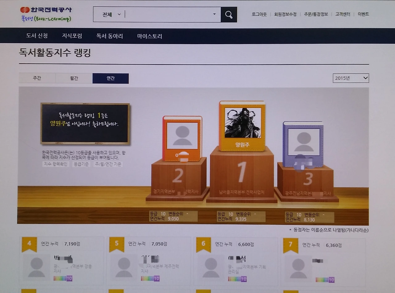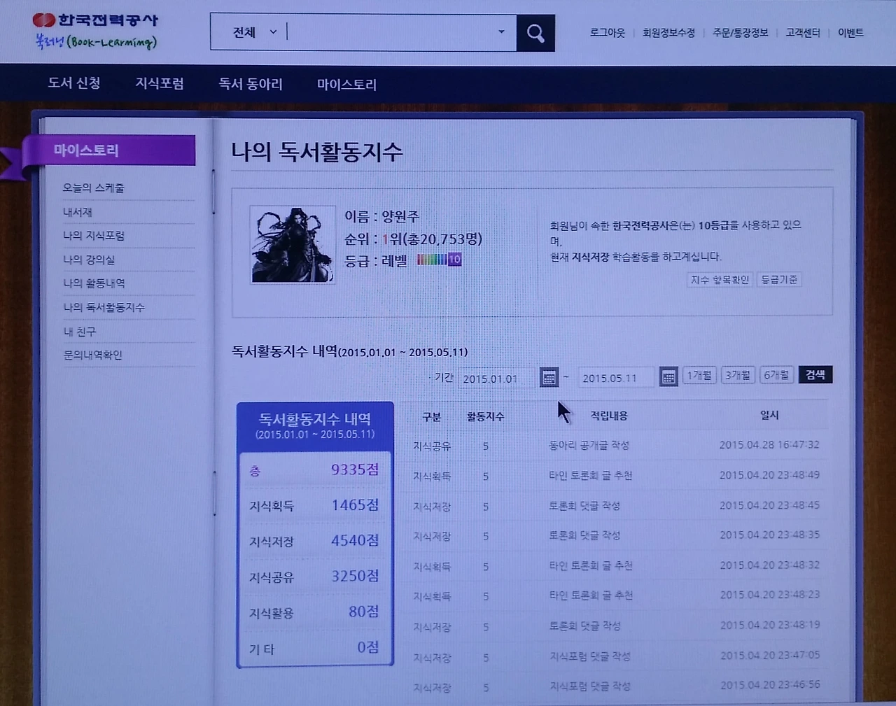 그렇지만 아쉽고 속상한 것은 또 속상한 거겠죠. 한때 그러니까 꽤 예전인 몇 년 전 이야기입니다. 그때 북러닝 교육 활동지수의 최대치가 없던 때 저는 그 세계에서는 꽤 유명인이었습니다. 회사 전체 인원 중에서 활동지수 1등을 유지하고 있었으니까요.