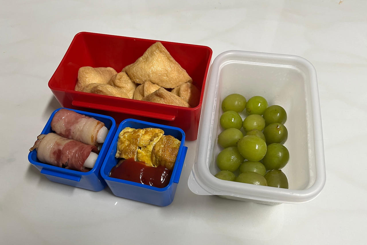 유부초밥과 베이컨 떡말이와 계란말이와 샤인머스킷