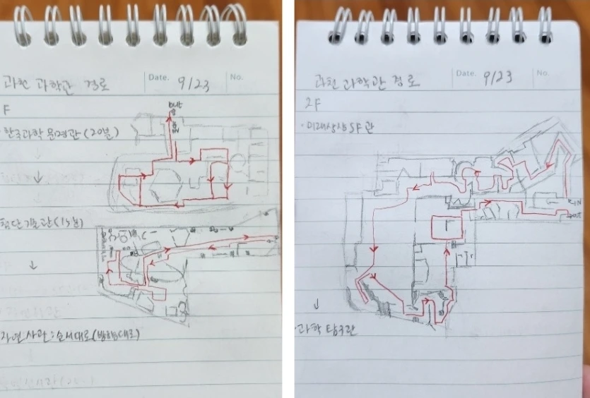 급기야 어젯밤에는 과학관 홈페이지를 들어가 지도를 보면서 그걸 옮겨 그리더니 개략적인 이동경로도까지 작성하는 것이 아니겠어요? 왜 그걸 하냐고 물어보니 답변이 비슷합니다. "그냥요, 재밌잖아요."