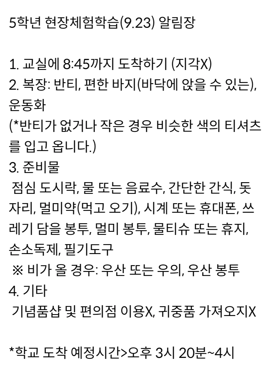 심지어 2호는 제 기준에서는 이해가 되지 않는 행동까지 하기 시작했습니다. 제 평생 듣지도 보지도 못한 현장체험학습 준비표를 만드는가 하면