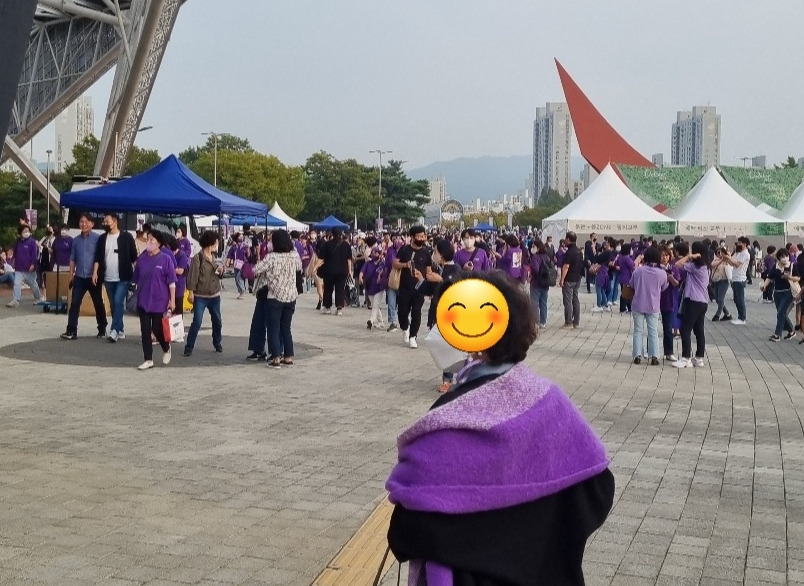 처음에 어머니께서 보라색으로 최대한 맞춘 패션을 저희 앞에서 선보이셨을 때는 살짝 어색하다고 느꼈습니다. 하지만 보라색으로 가득 찬 올림픽공원 광장 안에서 찍으신 사진을 보니 다른 분들과 견주어봐도 굉장히 준수한 복장이 아닌가 생각됩니다.