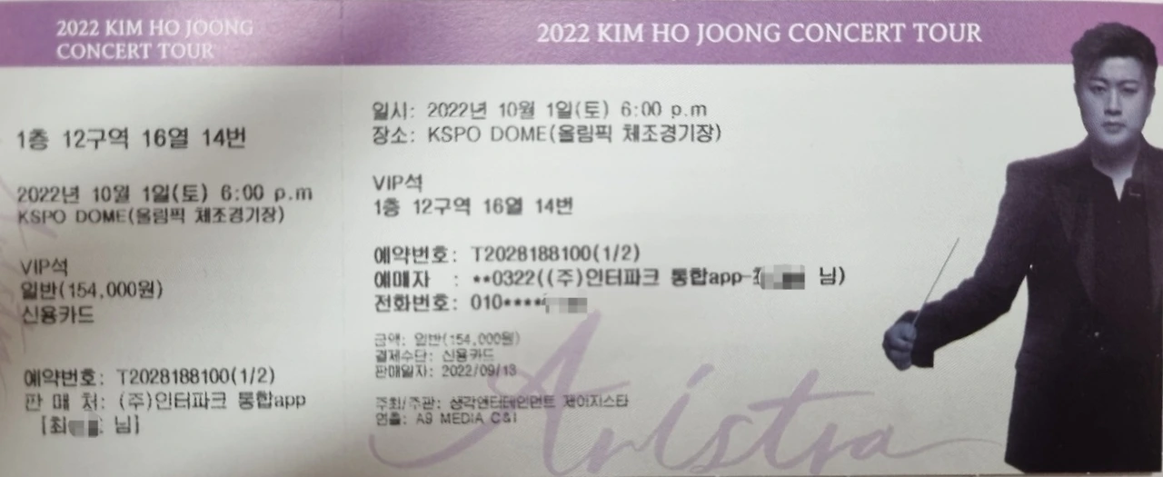 그러던 어느 날 제수씨 덕분에 저희 형제 내외는 어머니께 효도를 할 수 있는 기회를 얻게 되었습니다. 제수씨가 다른 일로 맘카페에 접속했다가 김호중의 첫 번째 전국투어 콘서트 티켓을 중고로 판매한다는 글을 발견한 것입니다. 평소 판단과 행동이 기민한 편이었던 제수씨는 이것저것 가리지 않고 본능적으로 구매하겠다는 글을 올려서 표를 확보했습니다. 이 실행능력 존경합니다.