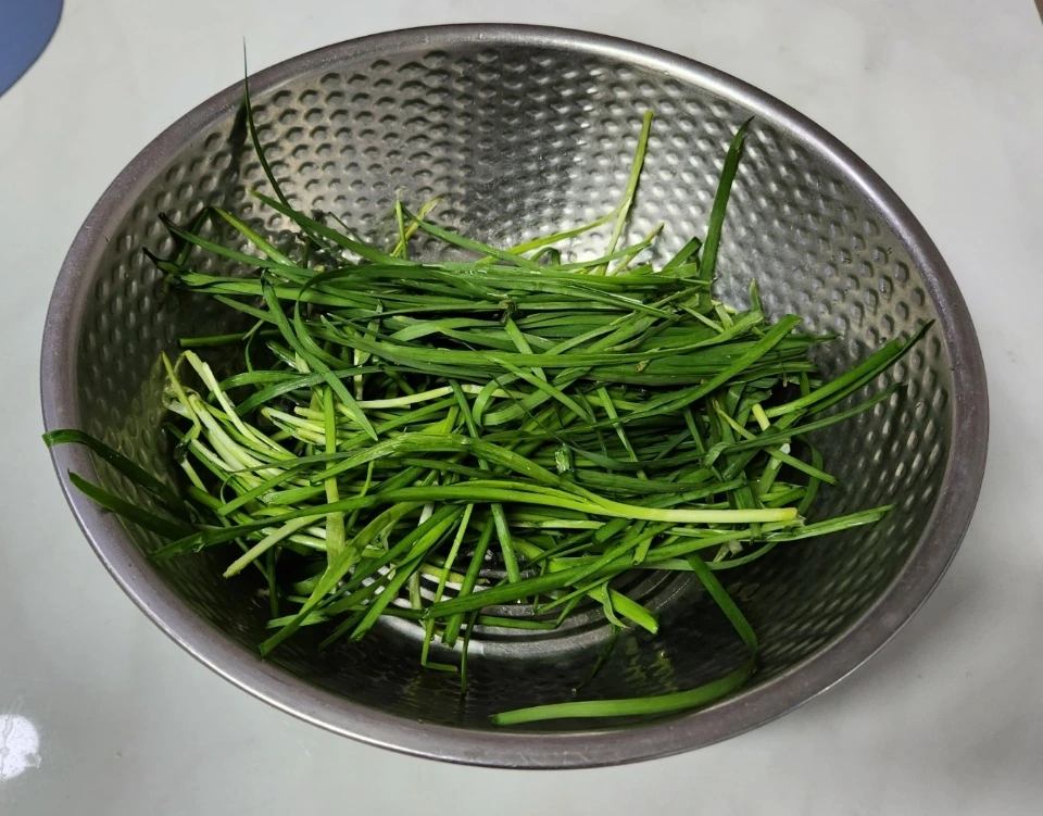 그런데 부추를 집어 들자마자 큰 문제점을 하나 발견했습니다. 생각보다 양이 너무 많았던 것이죠. 제가 필요했던 양은 어른 손가락 기준으로 엄지손가락과 검지로 만드는 동그라미 모양에 들어갈 정도의 양이었습니다.