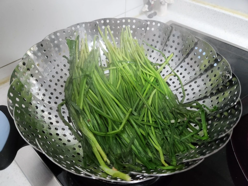먼저 부추를 냄비 안에 장착한 찜기 위에 올렸습니다. 그런데 하도 부추 냄새를 맡아서인지 부추 녹은 냄새가 씻은 부추에서도 나는 것 같은 것이 아니겠어요.. 그 냄새는 맡아본 분들은 아시겠지만 그리 싱싱한 부추의 향과는 사뭇 다른 유쾌하지 못한 냄새입니다.