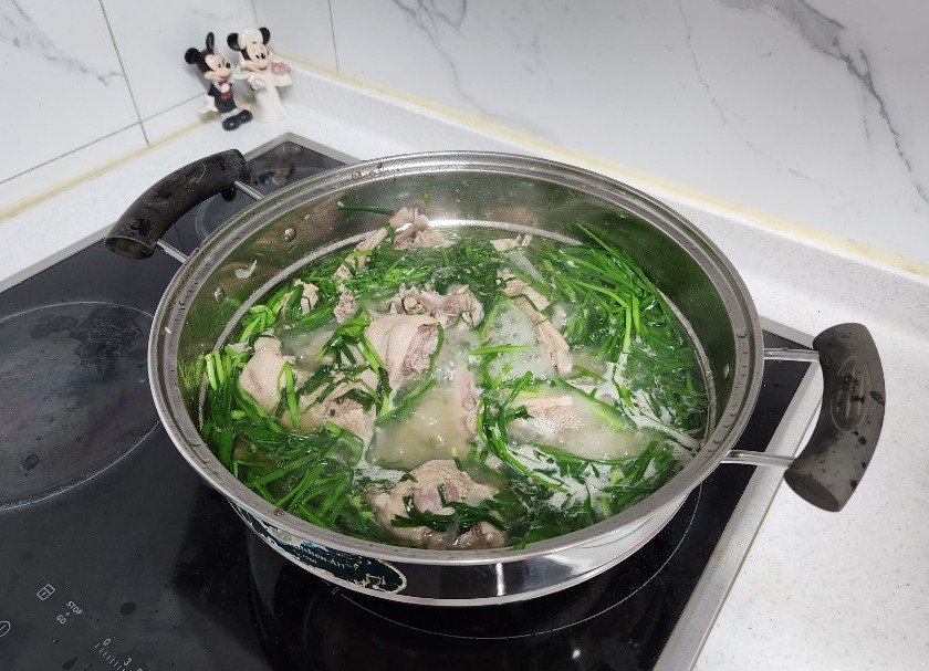 마지막 퍼즐인 부추를 잘라서 집어넣으니 모양은 제법 백숙 전문점에서 파는 오리백숙 같아 보입니다. 아내와 아이들은 냄새가 온 집안에 퍼지기 시작하자 관심을 가지기 시작했고 근처를 오며 가며 제가 준비하는 모습을 지켜보더니 계속 반신반의합니다. 믿음이 가지 않는 모양입니다. 그래도 제가 만든 요리 중에서 실패한 것은 거의 없었기에 믿고 먹어보라고 권해봅니다.