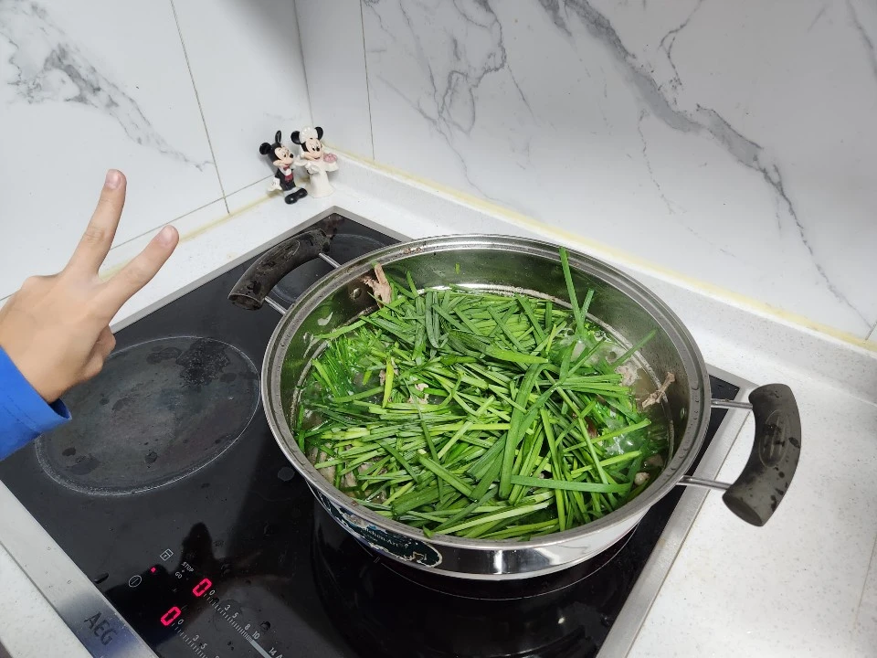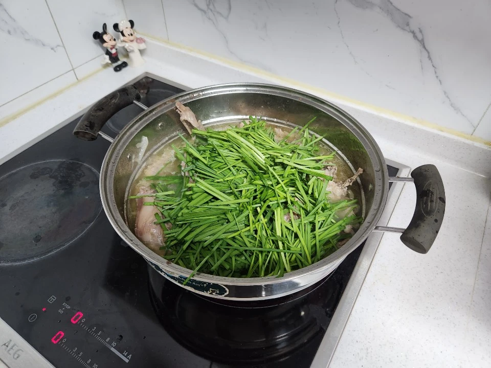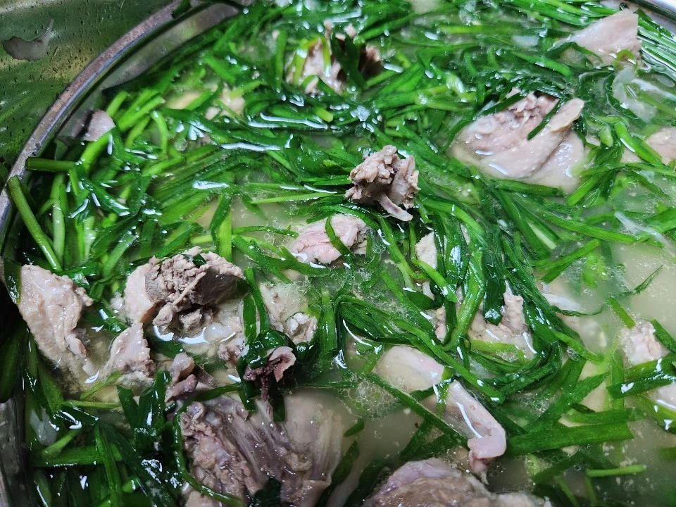 그냥 이렇게만 더 익혀서 바로 먹을 수도 있었습니다. 그런데 제가 오리백숙을 준비하는 데 도움을 주신 어플 '만개의 레시피' 선생님께서 부추를 넣어 먹으면 훨!씬! 맛있다는 내용을 보고 마음이 흔들립니다.