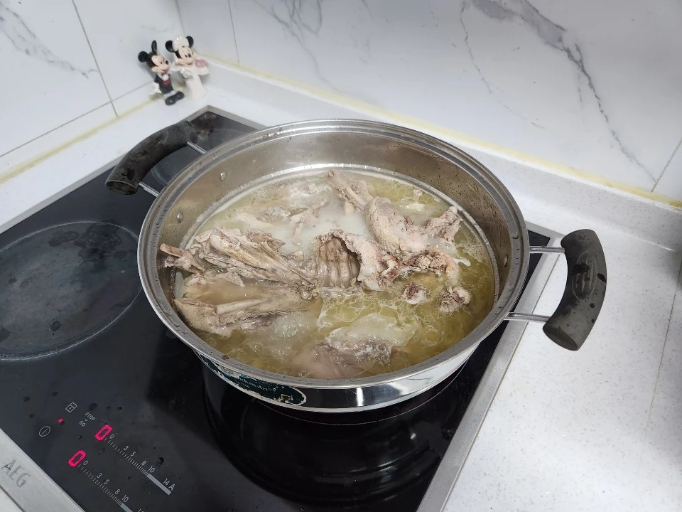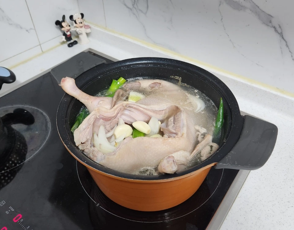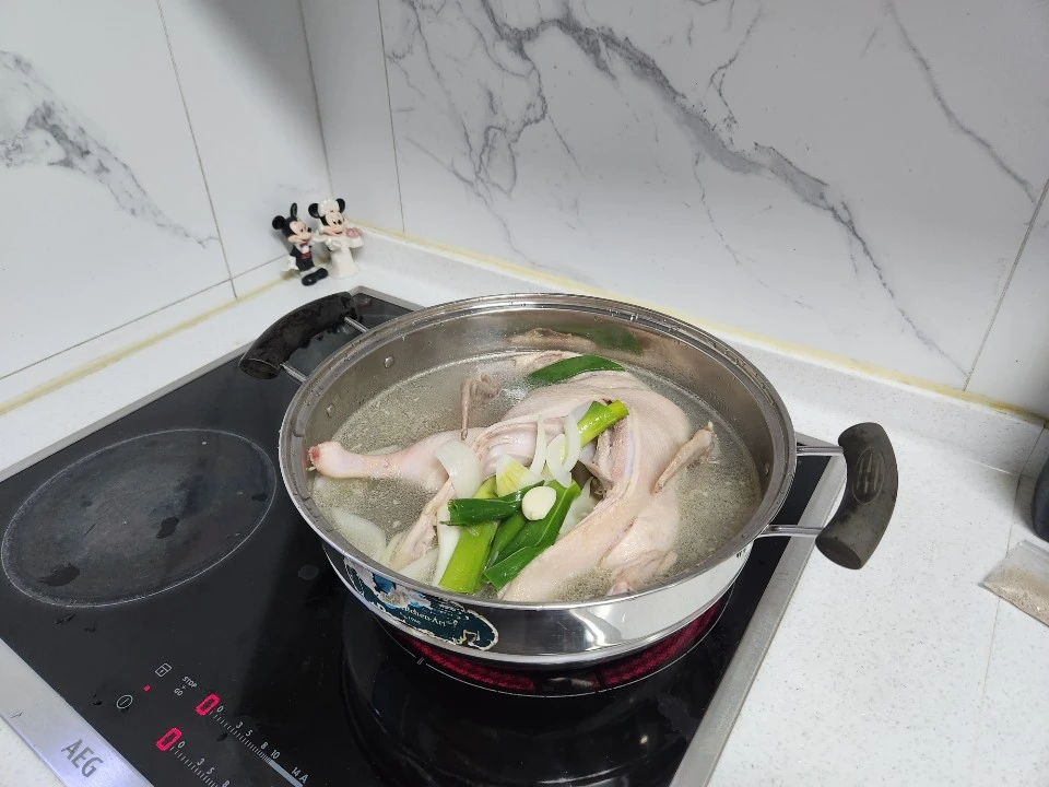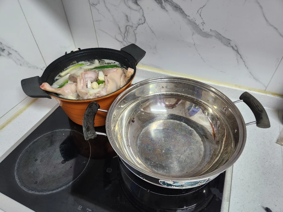 넓은 냄비로 오리가 이사 가서 새로이 자리를 잡으니 제 마음도 넓어지는 기분입니다. 이제는 고기가 잘 익을 때까지 팔팔 끓이는 일만 남았습니다. 원래 자주 가던 백숙집은 커다란 압력밥솥에 넣어 고온으로 찌는 방식이지만 일단 여기는 식당이 아니니까 되는대로 하겠습니다.