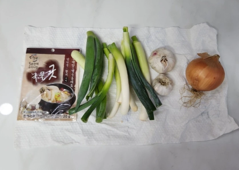 물이 찬찬히 끓어가고 있는 동안 추가로 넣을 재료들을 차근차근 준비하기 시작합니다. 어차피 도움을 받을 수 있는 메뉴가 아니었기에 혼자서 고군분투합니다. 요리하는 글을 몇 번 써봤다고 이제 제법 준비하는 속도도 제법빨라졌네요. 일단 오리백숙 패키지 안에 들어있던 기본 국물용 재료를 비롯해 대파, 마늘, 양파를 가지런히 내려놓습니다.