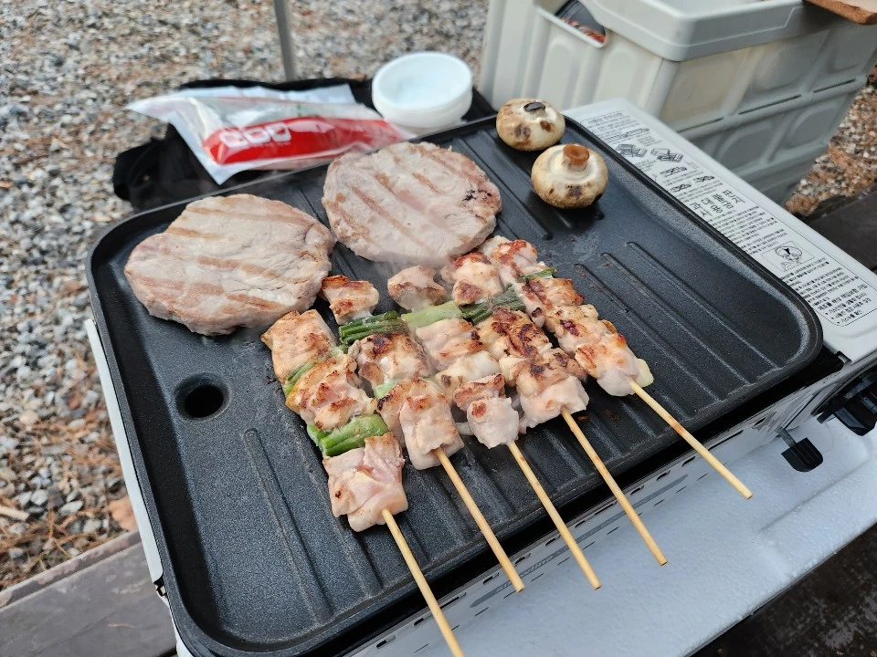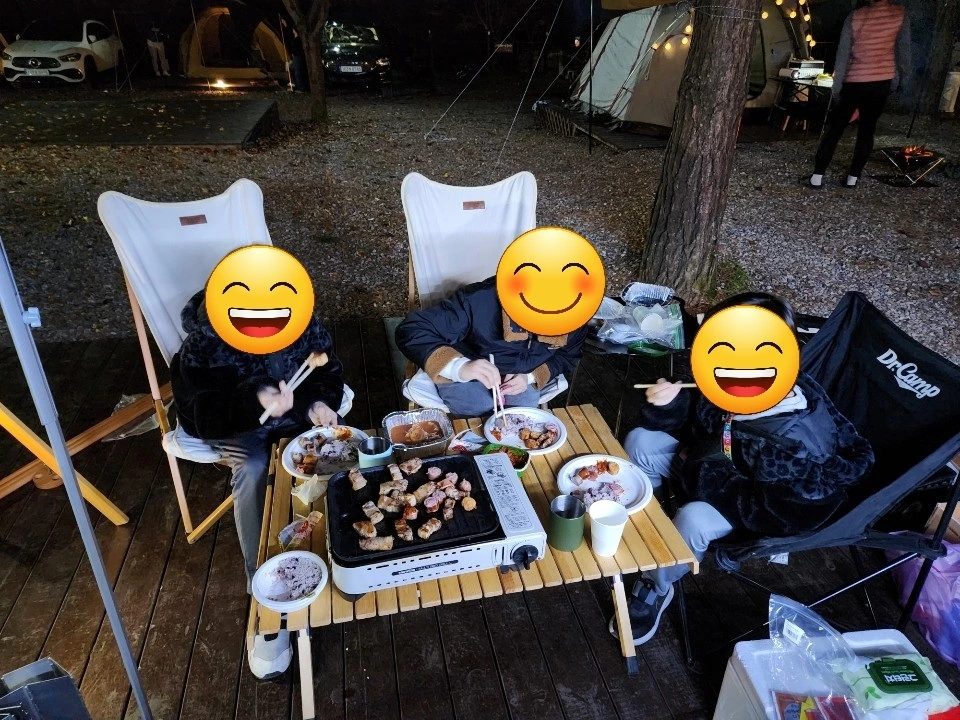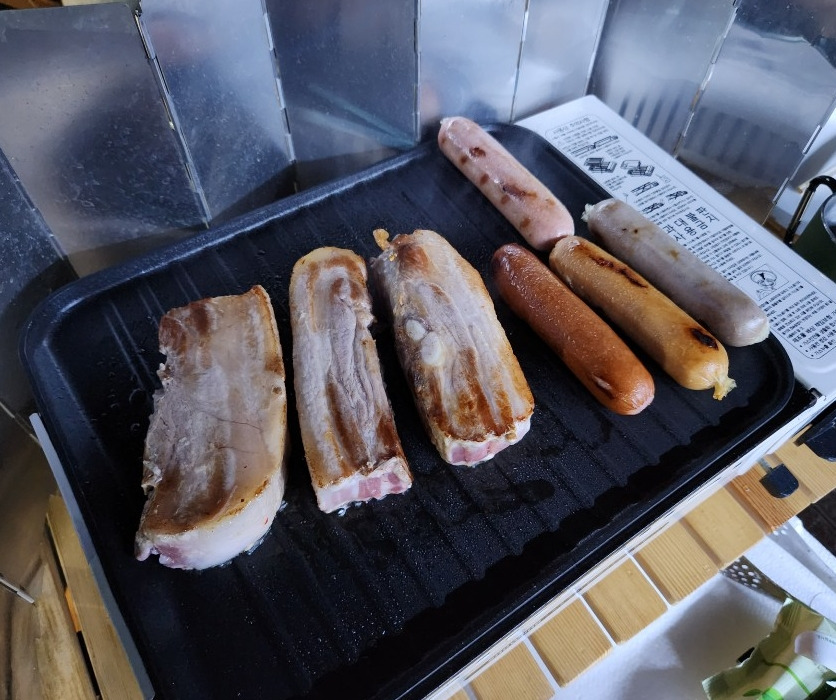 저녁 메뉴는 목살, 닭꼬치, 새우 라면입니다. 이번에도 역시 아이들이 엄청 잘 먹어서 저는 눈치를 보면서 먹었네요. 여차하면 밖으로 나가서 더 사 오면 되지만 이틀째 저녁 때문에 아이들만 두고 나가기도 어렵고 더욱이 펼쳐진 캠핑카를 다시 접어서 나가기 또한 너무 귀찮았습니다.