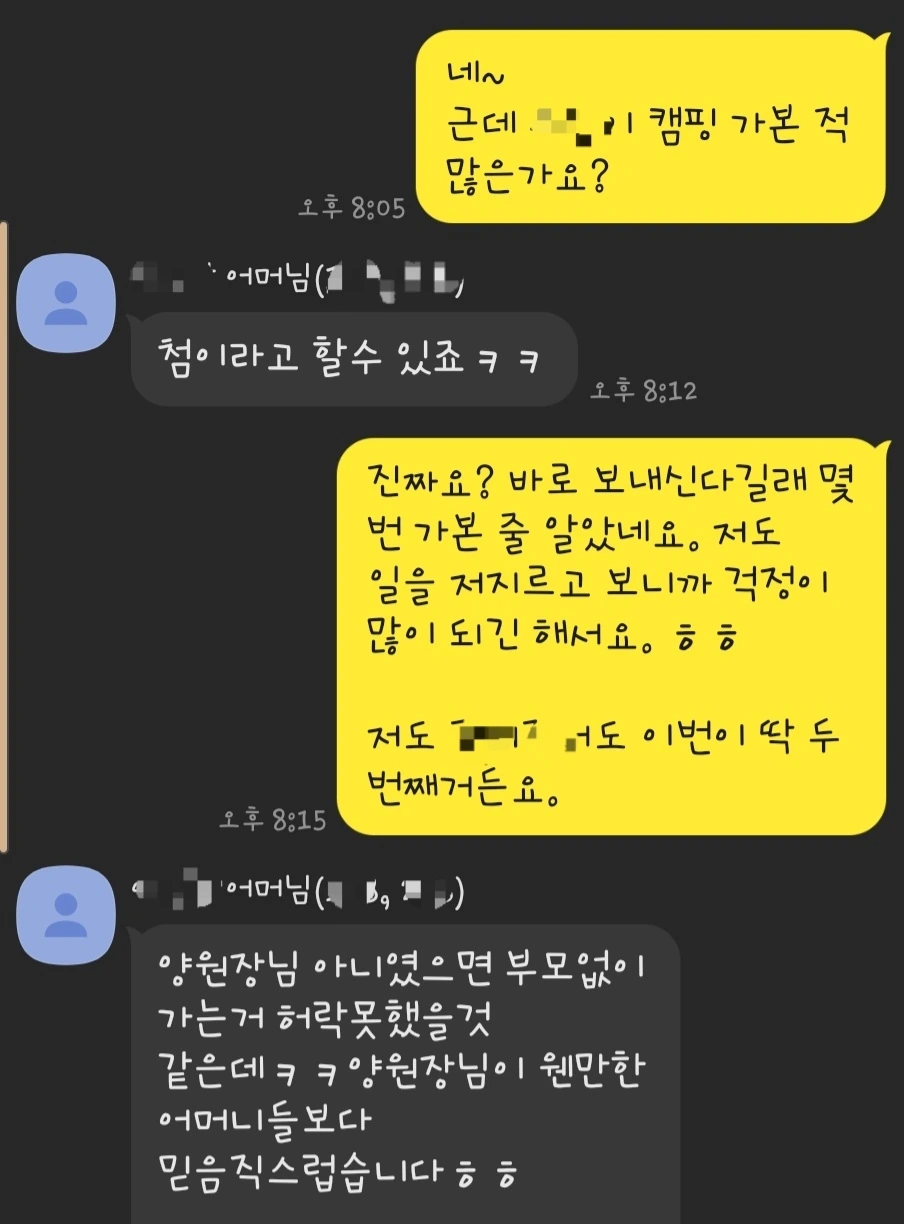 ㅇㅇ이 어머니께 뭘 믿고 두 번째 캠핑을 가는 제게 아이를 맡기느냐고 여쭤보았더니 이렇게 답을 하십니다.