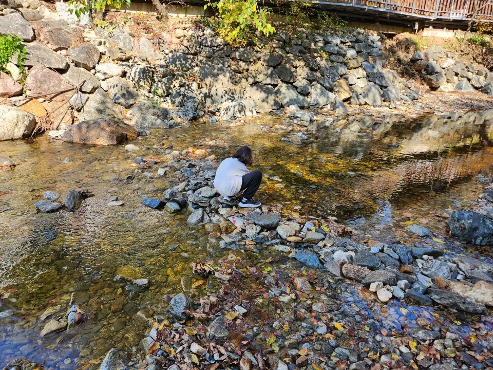 계곡 구경을 하면서 겨울잠을 자고 있던 개구리도 발견하고 물수제비도 열심히 하면서 즐거운 시간을 함께 보냅니다. 그러다가 저는 갑자기 아이들에게 기괴한 제안을 합니다.