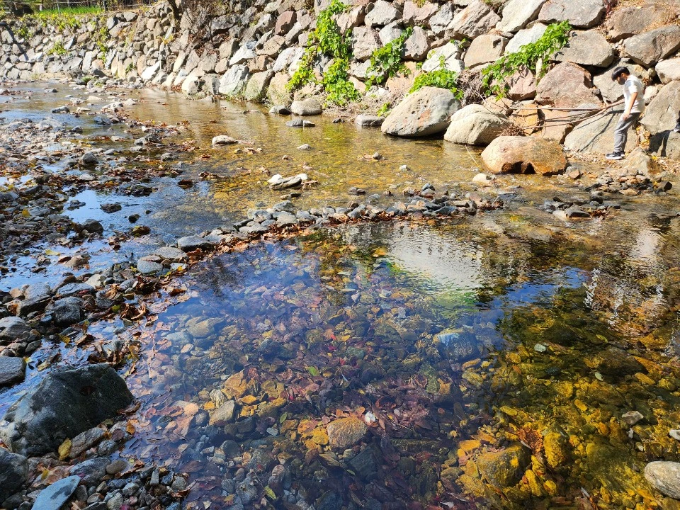 저쪽으로 넘어가기 위해 밟을 수 있는 큰 돌은 두세 개 정도뿐입니다. 그야말로 맨땅에 헤딩입니다. 아이들은 저와 수준이 비슷했는지 그때부터 일꾼으로 변신합니다.
